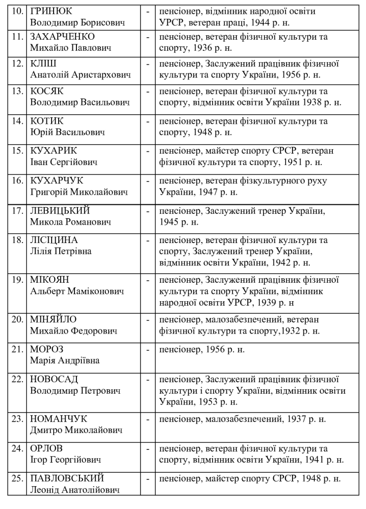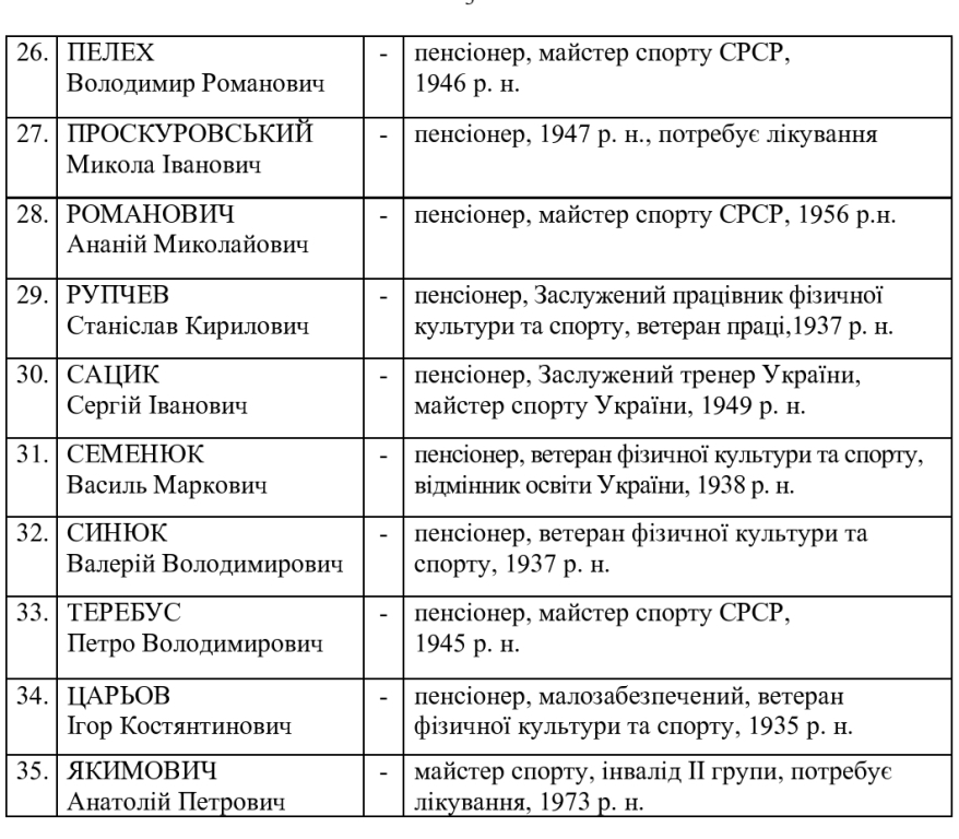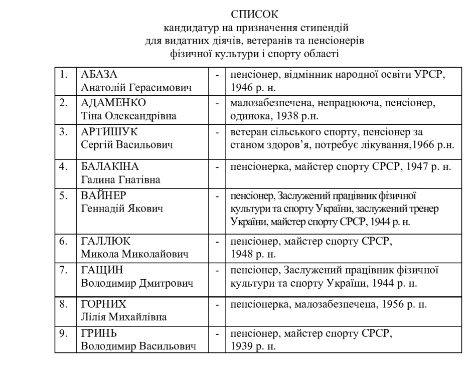 До списку кандидатур на призначення стипендій увійшли майстри спорту, особи з інвалідністю, пенсіонери, заслужені працівники фізичної культури та спорту України.