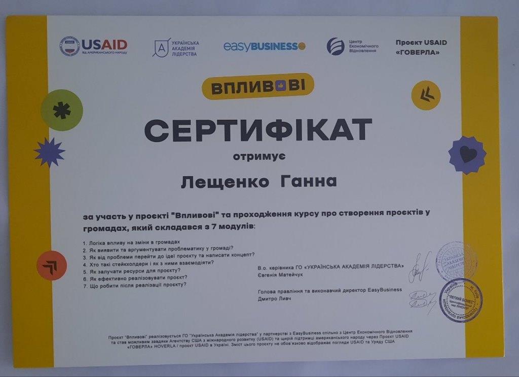 На завершення заходу усі учасники отримали сертифікат за участь у проекті «Впливові» та проходження курсу про створення проектів у громадах, який складався з 7 модулів.