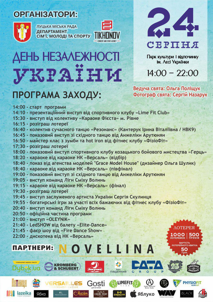 “Нові локації, різноманітні food-зони, програма, котра залишить тільки позитивні емоції відвідувачів заходу, розваги для всієї сім’ї, всеміська лотерея з понад п’ятсот подарунками, релакс зони від партнерів, лунопарк, дитячі гірки, цікавинки від партнерів та організаторів — це і ще багато інших сюрпризів чекає саме вас 24-го серпня з 14:00 до 22:00 у Центральному парку культури та відпочинку ім. Л. Українки”, — розповідають організатори.
