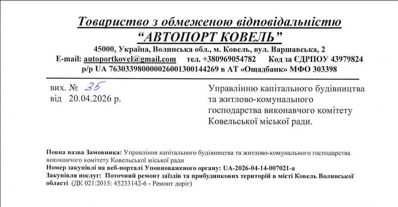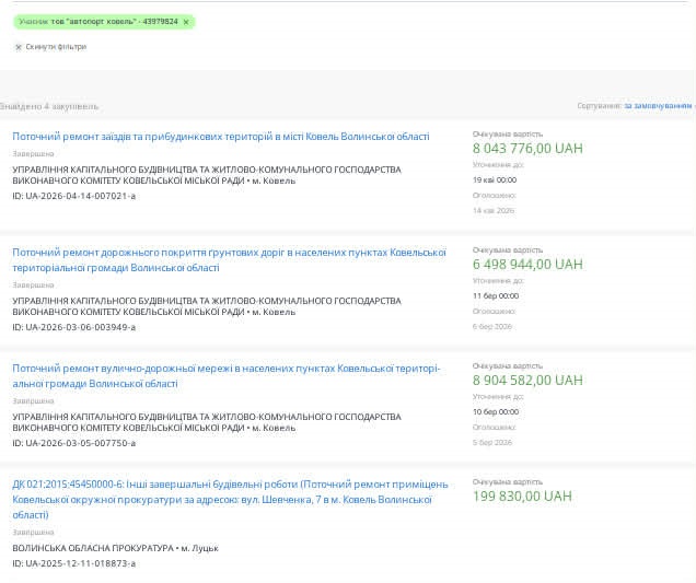 А у 2026 році компанія «Автопорт Ковель» отримала одразу два підряди по декілька мільйонів гривень на ремонти доріг від управління капітального будівництва Ковельської міської ради. Раніше у попередніх закупівлях, де переможцем виступало ТОВ «Ідея», управління капітального будівництва Ковельської міської ради, як правило, встановлювало вимогу щодо наявності досвіду виконання аналогічних договорів та наявності працівників відповідної кваліфікації. Чому ж під час останніх закупівель внесли зміни у тендерну документацію і не вимагають досвіду у підрядника, як у попередніх закупівлях?