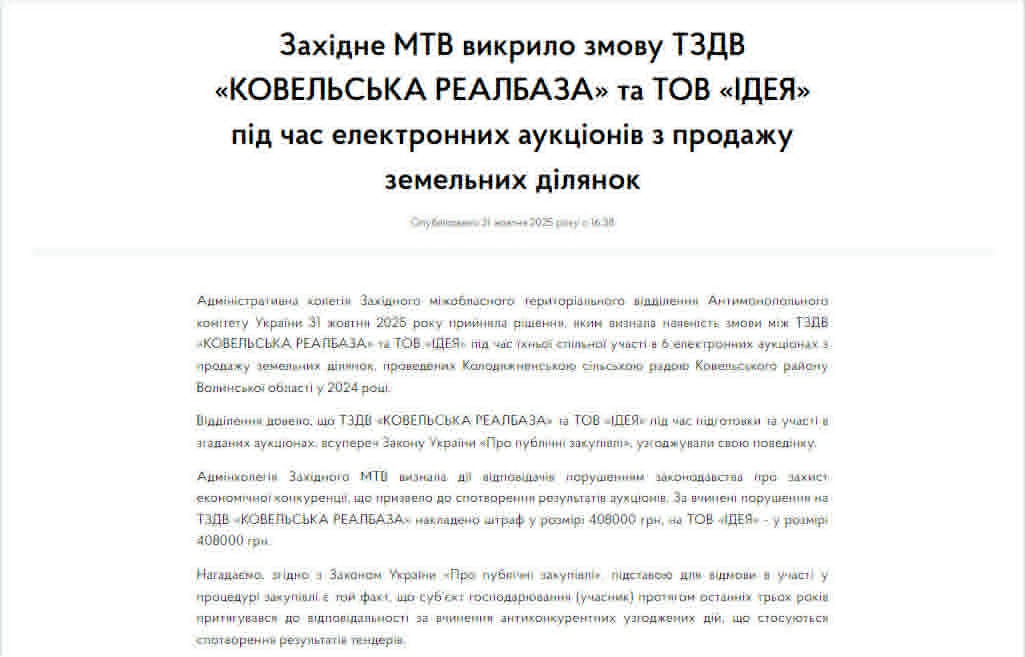 Через змову під час земельних торгів волинська фірма три роки не може брати участі не лише в земельних аукціонах, а і в закупівлях.