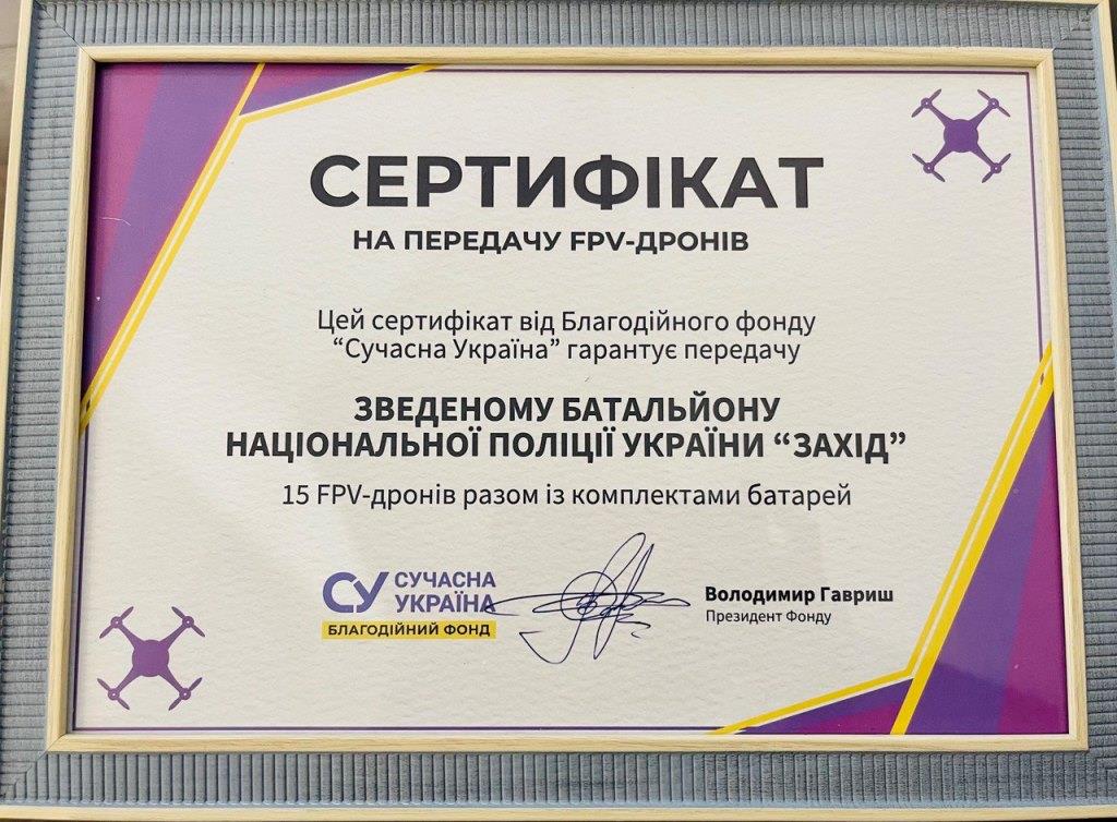 «15 FPV-дронів передали представники благодійного фонду «Сучасна Україна» – Modern Ukraine для бійців батальйону «Захід».