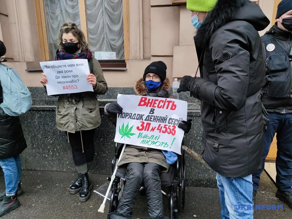 Як передає кореспондент “Укрінформу”, мітингувальники тримали плакати з вимогою внести до парламенту законопроєкт № 4553 щодо легалізації медичного канабісу.