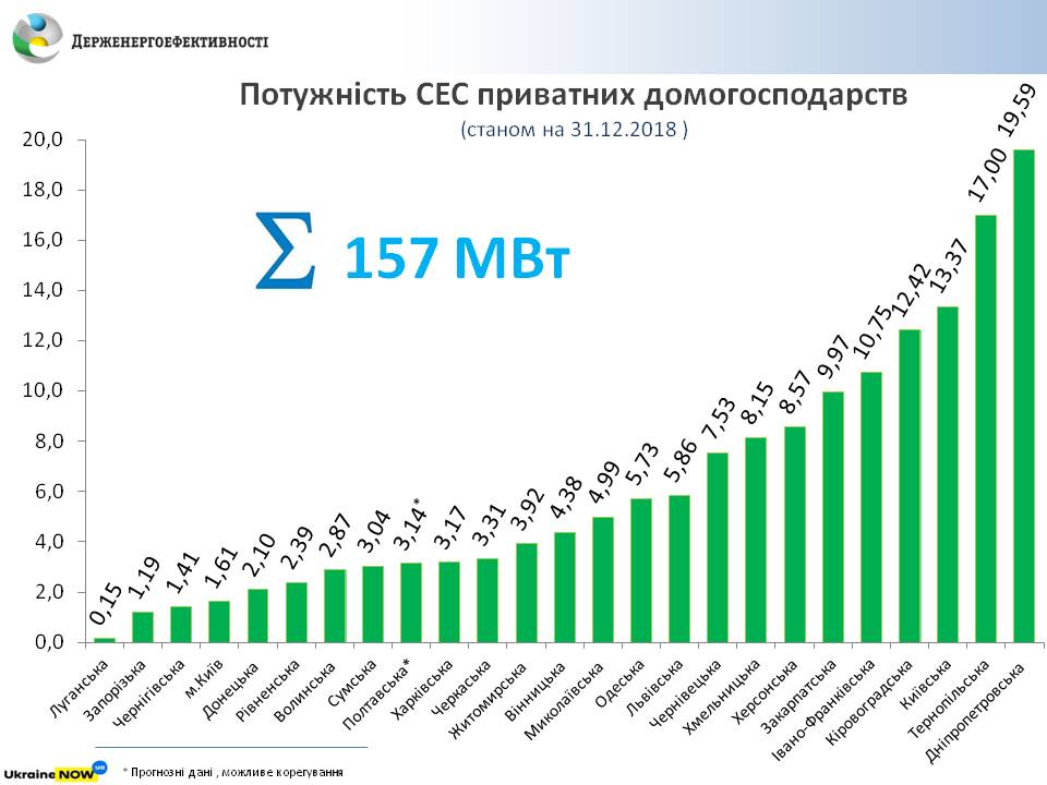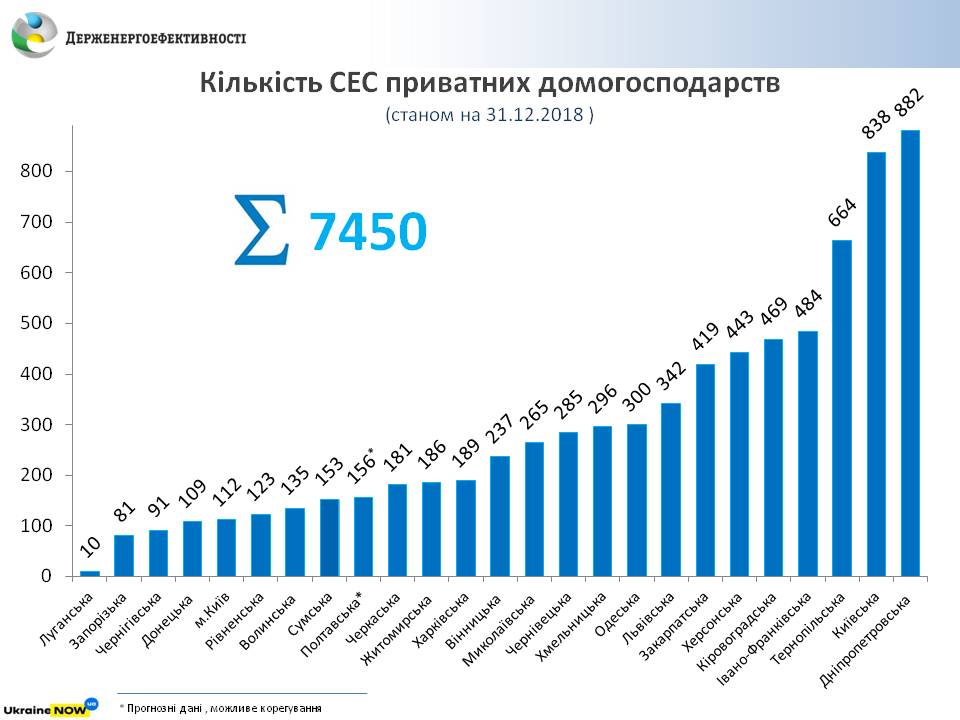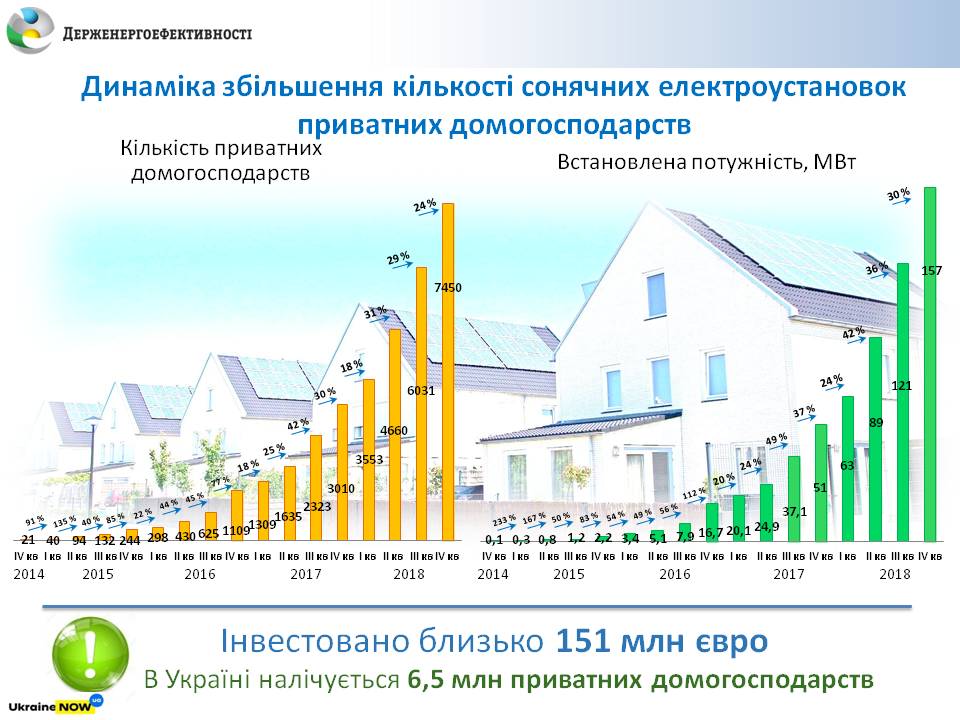 Станом на кінець 2018 року близько 7,5 тис. українських родин встановили сонячні електростанції (СЕС) загальною потужністю майже 160 МВт.
