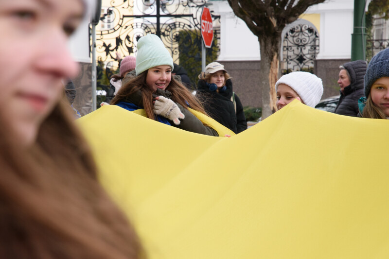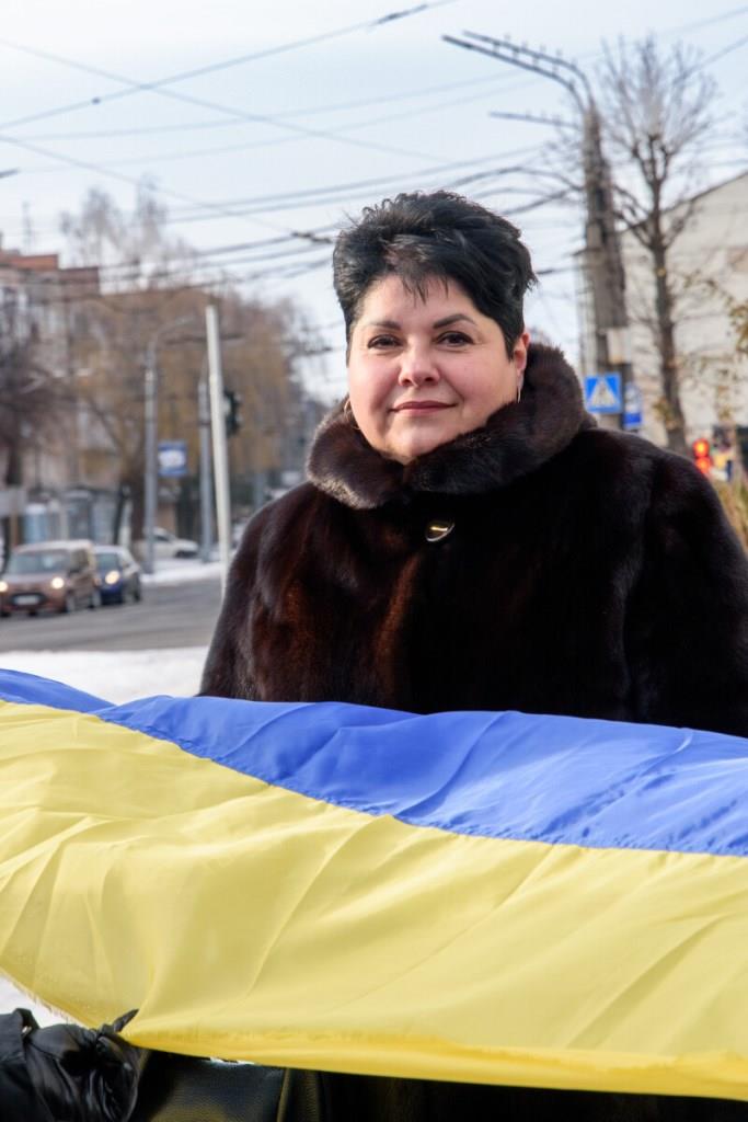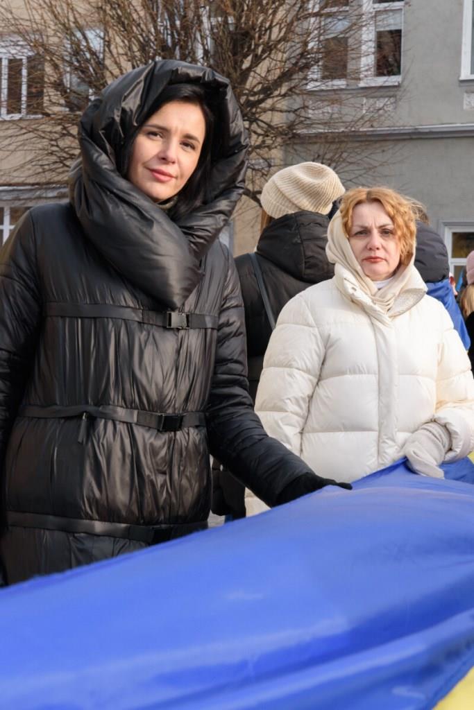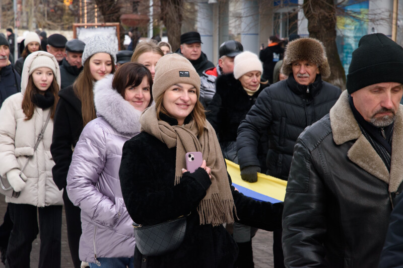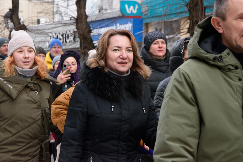 Після цього учасники акції розгорнули 200-метровий синьо-жовтий прапор і вирушили з ним вулицею Лесі Українки. Першими йшли музиканти військового оркестру Луцького прикордонного загону, за ними – рятувальники головного управління ДСНС у Волинській області, студентська молодь, військовослужбовці Державної прикордонної служби та небайдужі жителі громади. До участі у “Ланцюгу єднання” долучилася і заступник Луцького міського голови Ірина Чебелюк.