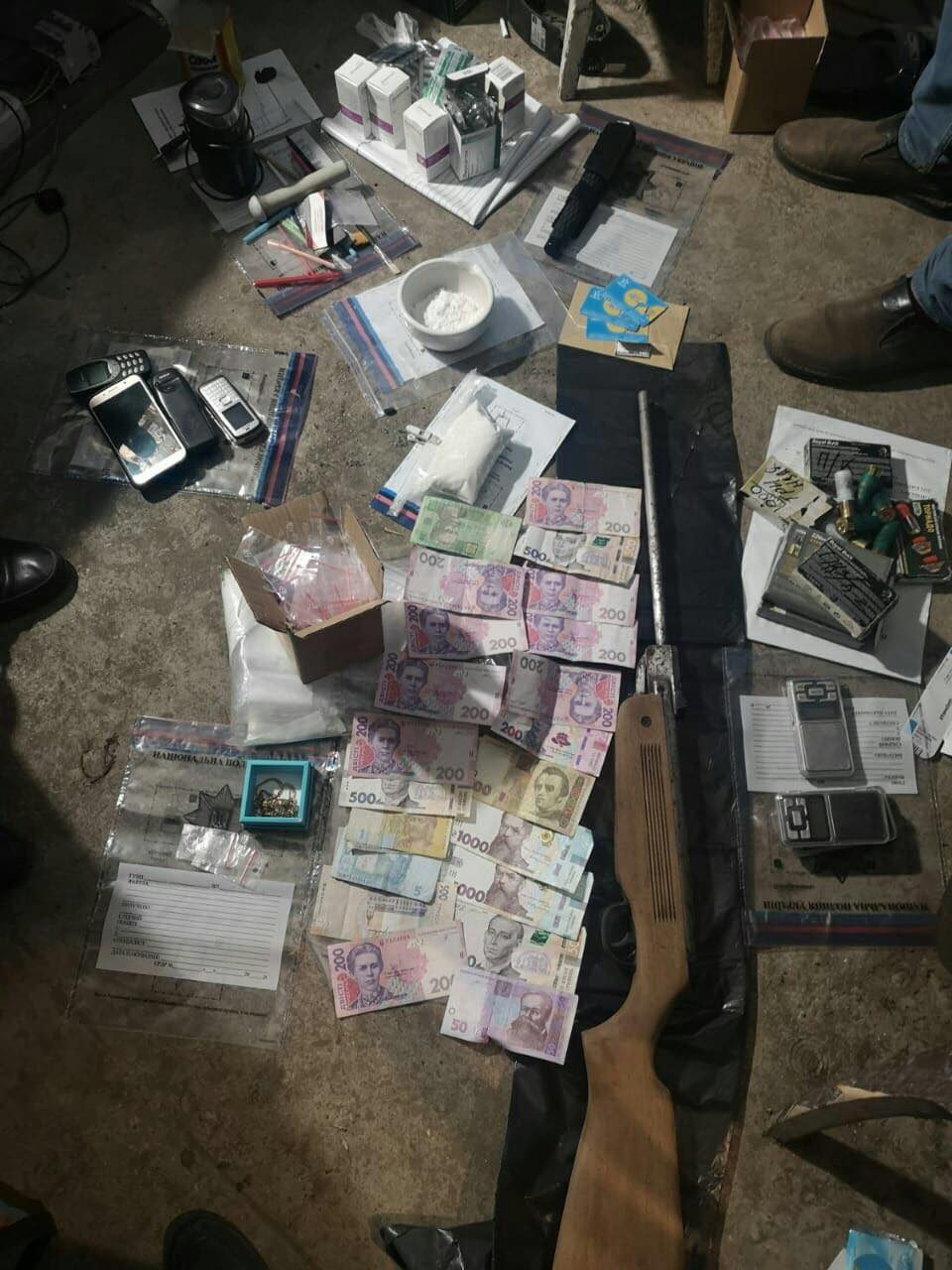У ході проведення санкціонованих судом обшуків у приміщенні нарколабораторії, оселях та транспортних засобах фігурантів вилучено 500 г готових до вживання психотропів, гроші,одержані від незаконного промислу, складові і обладнання для виготовлення й фасування амфетаміну, мобільні телефони, банківські картки, пістолет, гвинтівку та чорнові записи.