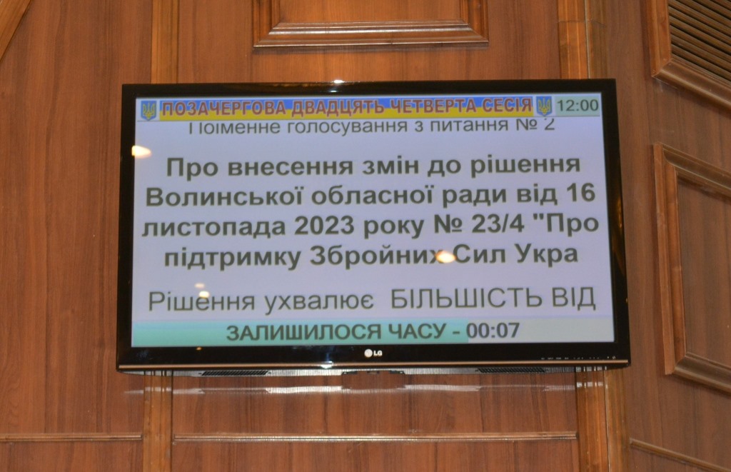 За внесення відповідних змін до рішення обласної ради від 16 листопада 2023 року № 23/4 «Про підтримку Збройних Сил України, військових формувань Національної гвардії, інших утворених відповідно до законів України військових формувань та правоохоронних органів, та деякі питання формування і виконання обласного бюджету у 2023-2024 роках» проголосували більшість депутатів.