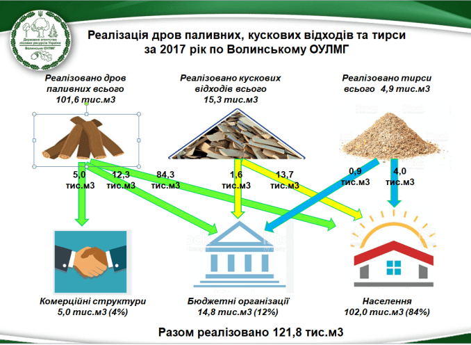 Протягом цього осінньо-зимового сезону державні лісогосподарські підприємства Волинського ОУЛМГ реалізували загалом 101,6 тис. м. куб. дров паливних. В першу чергу держлісгоспи забезпечували потреби населення області. Саме цій категорії споживачів твердого палива з лісу реалізували 84,3 тис. м. куб.