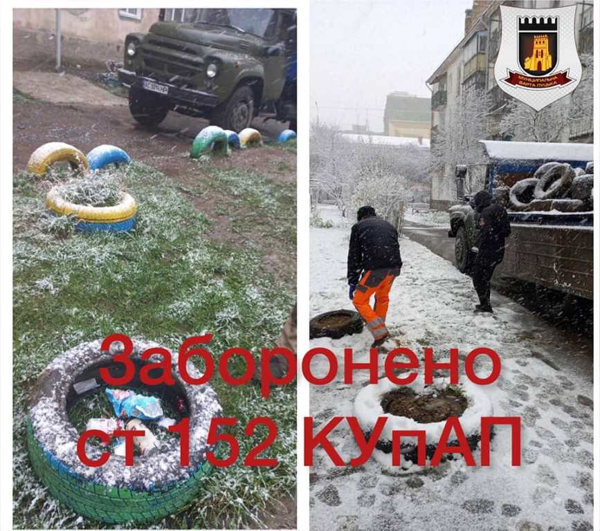 Повідомляємо, що самовільне розміщення різноманітних огорож, конструкцій, тимчасових споруд, а також засмічення території загального користування, зокрема використаними автомобільними шинами – згідно ст. 152 КУпАП тягне за собою відповідальність у вигляді накладення штрафу на громадян від 340 до 1360 гривень.