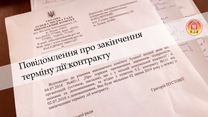 “Відповідно до рішення виконавчого комітету Луцької міської ради від 04.07.2018 №401-1 “Про порядок призначення керівників підприємств, організацій (установ, закладів), що є у міській комунальній власності”, зі змінами та доповненнями, та згідно з пунктом 5.2. контракту №111 від 02.07.2016 з доповненнями, Вас (директорку, Валентину Малютіну – ред.) звільнять 2 липня 2019 року у зв’язку із закінченням терміну дії контракту”, — йдеться у повідомленні.