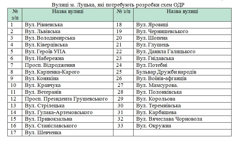 Відповідно до технічного завдання, передбачають розробку схем організації руху для 33 вулиць Луцька та 12 найбільш завантажених перехресть та місць (ділянок) концентрації ДТП.
