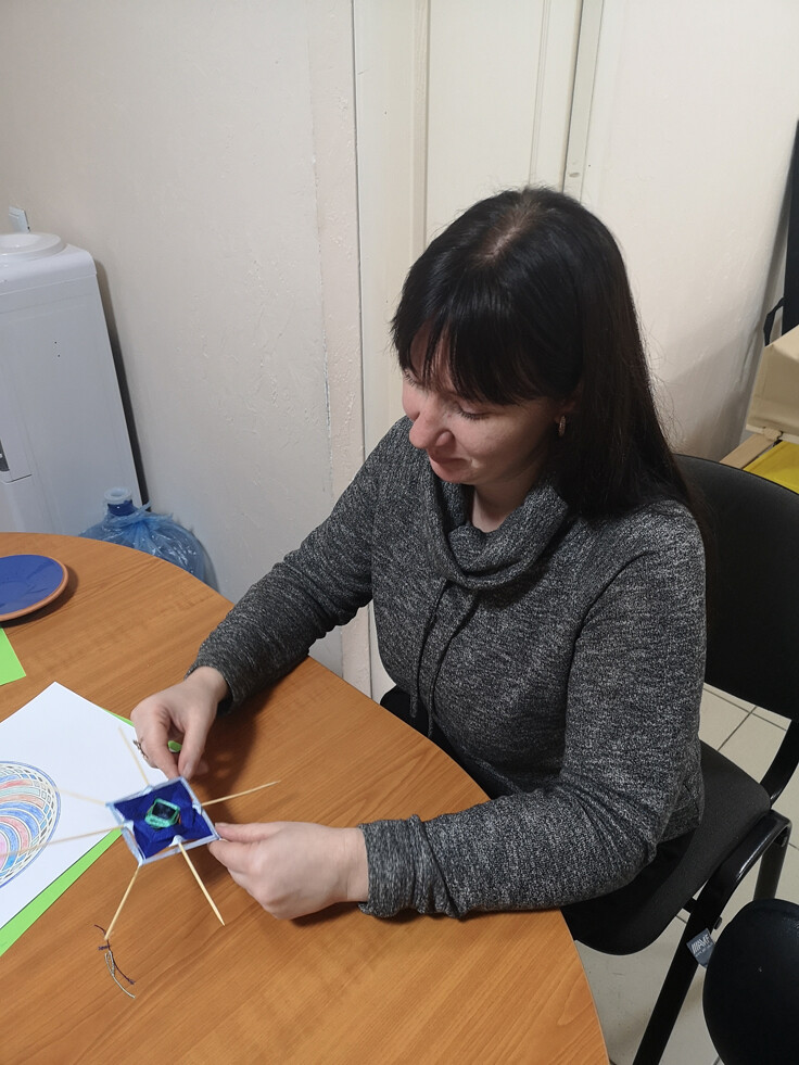 Створення чи малювання мандали допомагає відобразити внутрішній світ, це ніби зустріч із самим собою. Психолог, арт-терапевт Олена Солоненко на занятті відкривала для учасниць світ мандали та її можливостей. Учасниці спочатку розмальовували мандали, а потім власноруч створювали їх, використовуючи нитки.