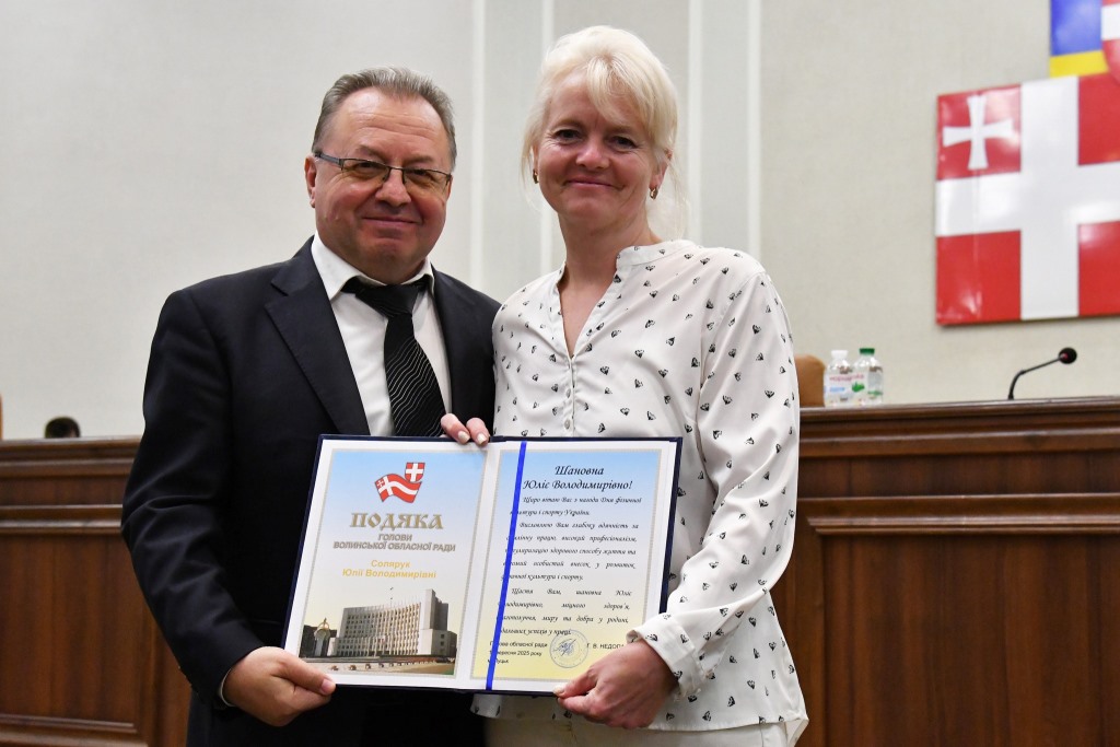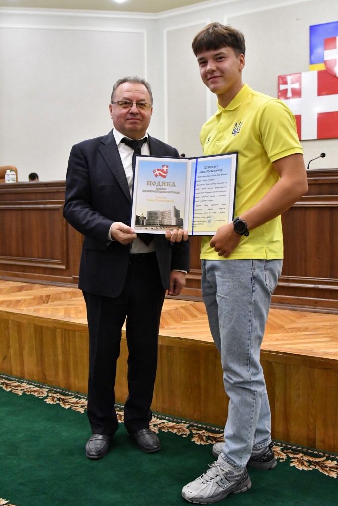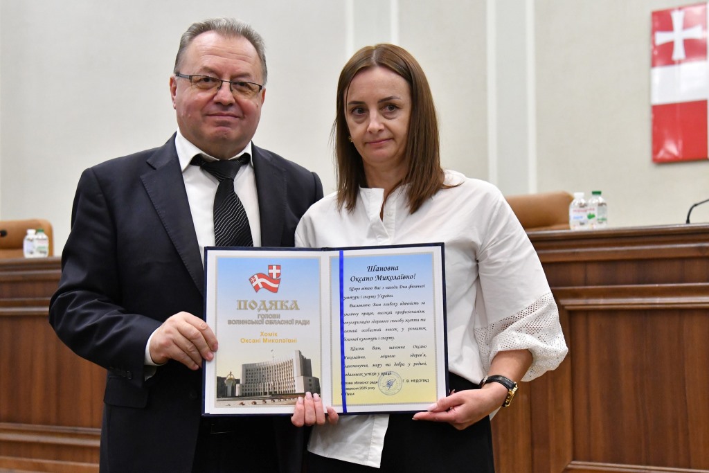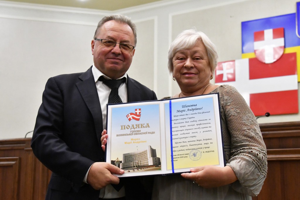 Подяку голови обласної ради за сумлінну працю, високий професіоналізм, популяризацію здорового способу життя та вагомий особистий внесок у розвиток фізичної культури і спорту оголошено: тренеру-викладачу з боксу Нововолинської ДЮСШ Віктору Артюху, голові Колодяжненської сільської ради Віталію Кашику, Майстру спорту України, спортсмену відділення веслування на байдарках і каное обласної спеціалізованої ДЮСШ олімпійського резерву «Олімп» Івану Кисілю, Майстру спорту України, спортсмену відділення веслування на байдарках і каное обласної спеціалізованої ДОСШ олімпійського резерву «Олімп» Тимофію Мельничуку, Заслуженому тренеру України, викладачу відділення боротьби вільної обласної ШВСМ Анатолію Милехіну, багаторічній працівниці галузі фізичної культури і спорту Марії Мороз, Майстру спорту України міжнародного класу з шахів Василю Недільку, фахівчині Волинського регіонального центру з фізичної культури і спорту осіб з інвалідністю «Інваспорт» Ганні Новоселецькій, спортсмену відділення боксу Нововолинської ДЮСШ Даніелю Панафідіну, тренеру-викладачу з боротьби вільної Володимирського спортивного ліцею Олександру Раковському, Гросмейстеру ICCF, судді ІІ категорії з шахів, керівнику гуртка «Шахи» у Нововолинському центрі дитячо-юнацької творчості Олегу Савчаку, Заслуженій майстрині спорту України Юлії Солярук, вчителю фізичної культури Гаразджанської гімназії Підгайцівської сільської ТГ Олександру Фешу, завідувачці кафедри «Фізична культура, спорт та освітні інновації» Академії рекреаційних технологій і права Оксані Хомік та спортсменці Національної збірної команди України з гімнастики художньої Олександрі Ющак. Подяками голови облради відзначено також членів команди з баскетболу Нововолинської дитячо-юнацької спортивної школи за зайняте І місце серед дівчат 2013 року сезону 2024-2025 «Дитяча ліга».