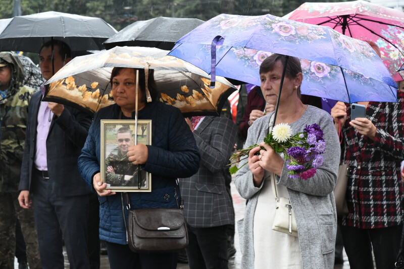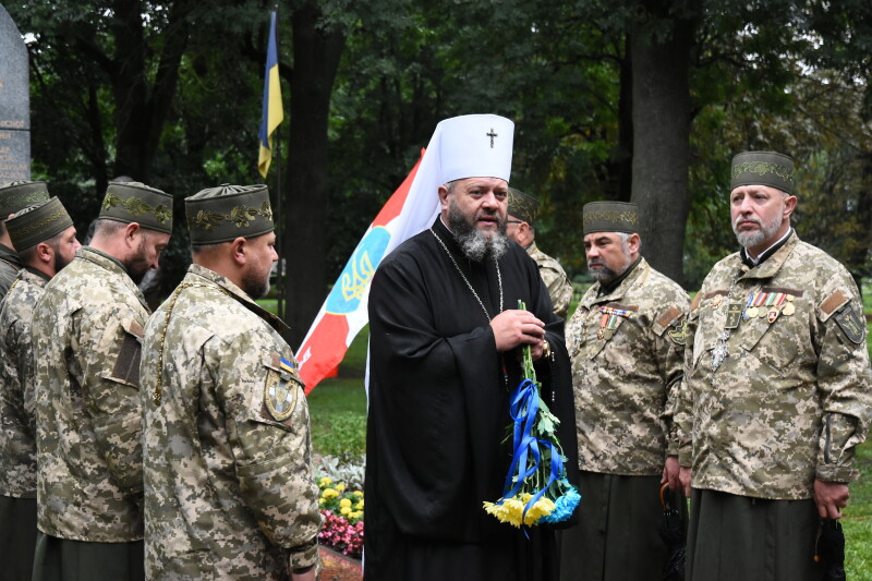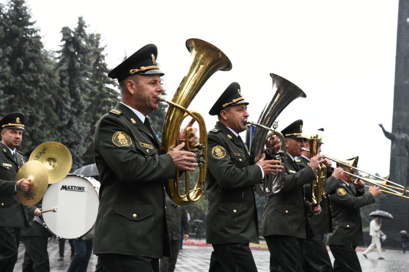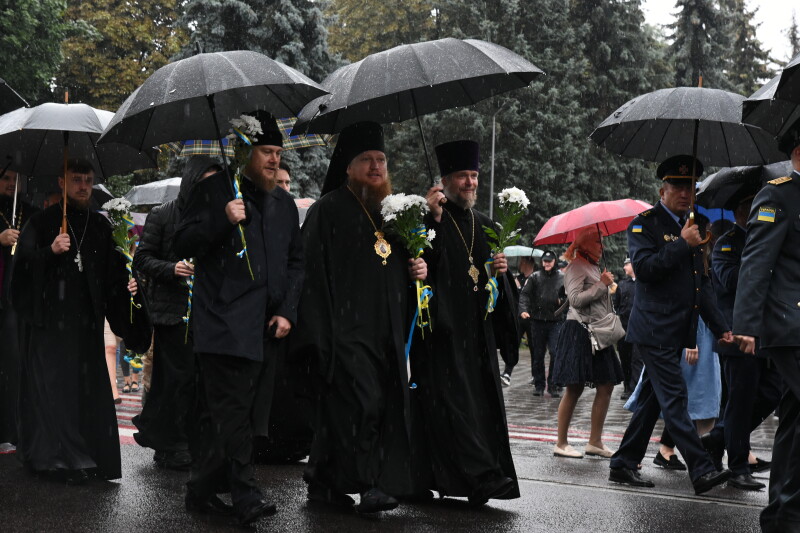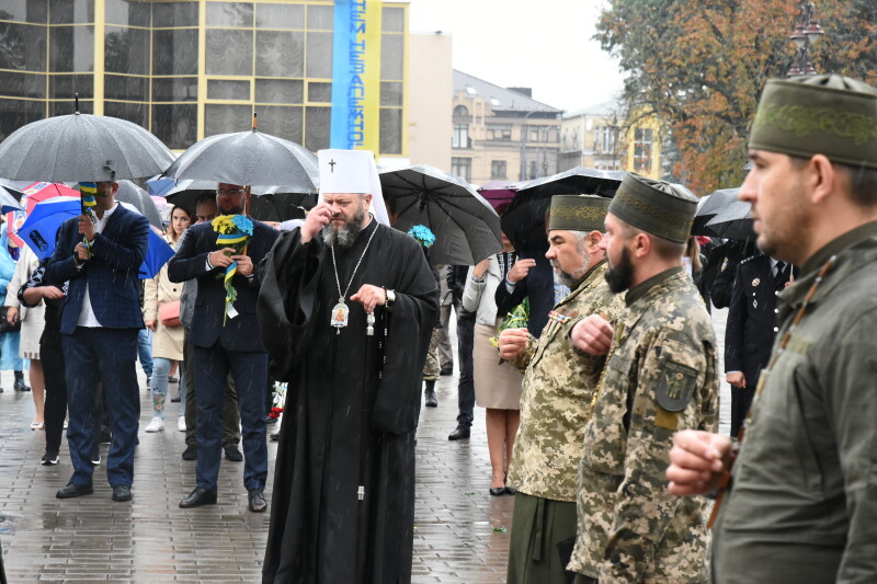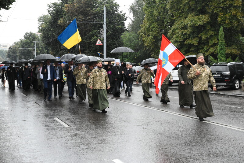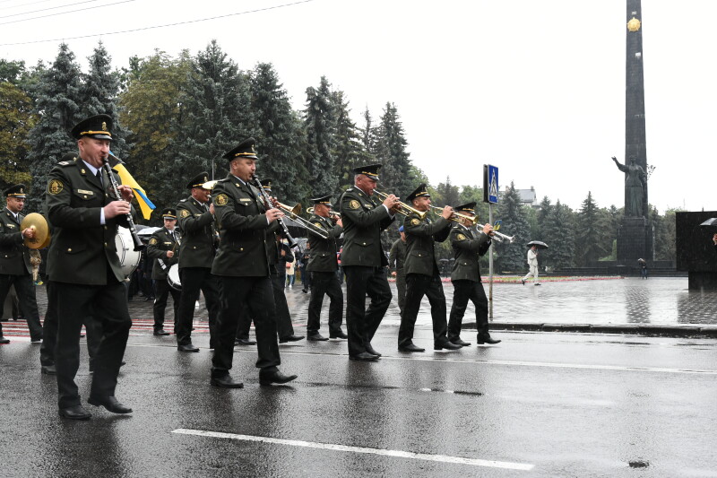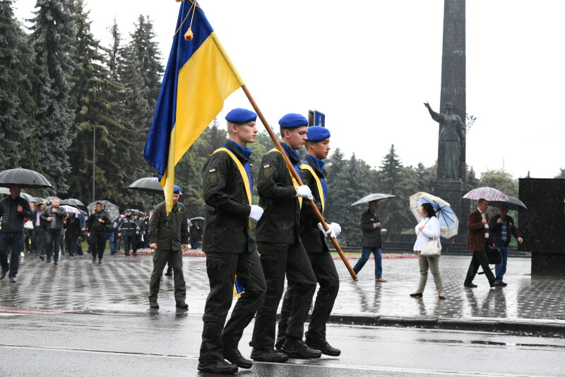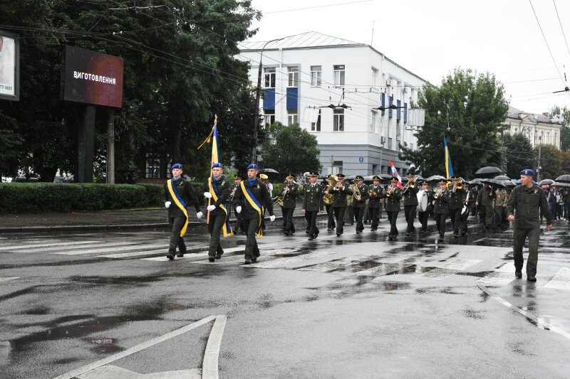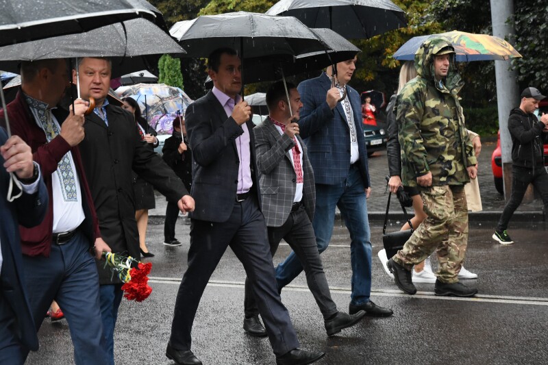 Потому присутні, за участі членів сімей загиблих в АТО/ООС військовослужбовців, учасників бойових дій на Сході, вирушили маршем захисників України від меморіального комплексу до Театрального майдану нашого міста.
