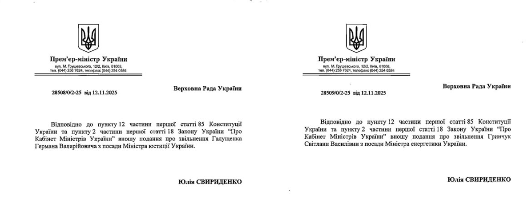 Президент Володимир Зеленський заявив, що міністр юстиції Галущенко та міністр енергетики Гринчук мають піти у відставку, а прем’єр Свириденко направила до ВР подання про звільнення цих двох міністрів.