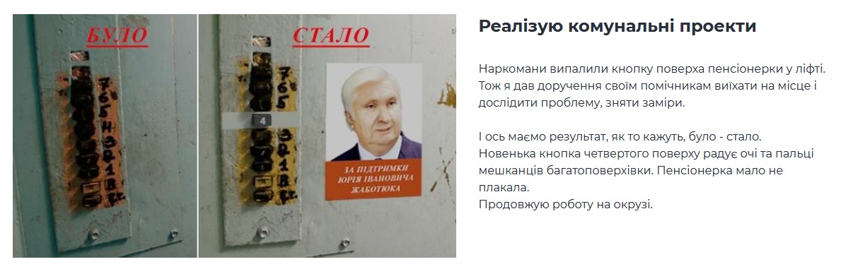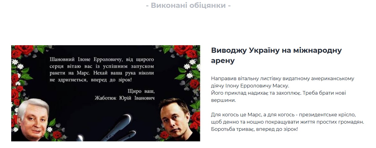Також сайт містить перелік виконаних обіцянок кандидата. Повідомляють, що Жаботюк виводить Україну на міжнародну арену.