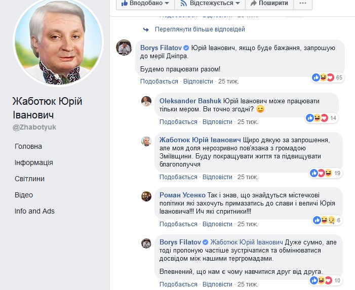 «Юрій Іванович, якщо буде бажання, запрошую до мерїї Дніпра. Будемо працювати разом!», – пише йому у коментарях мер Дніпра Борис Філатов.