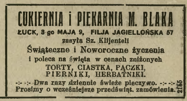 Вітав клієнтів з різдвяними та новорічними святами також кравецький заклад Н.Кірхман, що працював на вулиці Ягеллонській у Луцьку. Акції з нагоди свят влаштовував годинниковий магазин С.Рапопорта на Ягеллонській. Для кожного ласуна, дорослого чи малого, найважливішими ласощами під час свят називали тістечка, спечені на порошку доктора Августа Оеткера. Замовити перед святами свіжу випічку пропонували у цукерні та пекарні М.Бляка, яка працювала у Луцьку на вулицях 3-го травня та Ягеллонській. Вітаючи клієнтів, пропонували торти, тістечка, пончики та пряники за зниженими цінами.