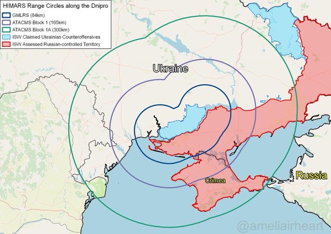 «Приблизний радіус дії РСЗВ, запущених із HIMARS з-під Херсона, позначений синім колом, – пояснив він. – Припускаю, що це скоро розпочнеться і призведе до послаблення російської оборони та рівня оперативної спроможності на північ від Криму».