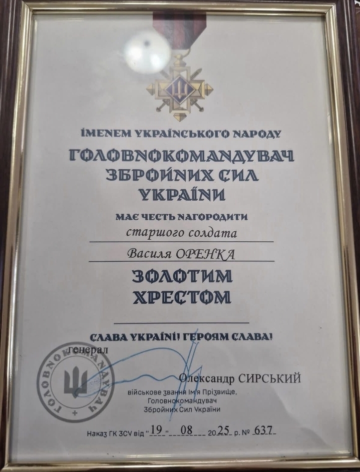 Військовослужбовця Василя Оренка, жителя села Радомишль, за Указом Головнокомандувача Збройних сил України від 19.08.2025 № 637 нагородили високою бойовою нагородою за відвагу та честь, незламний бойовий дух та проявленні здібності у бойових завданнях – нагрудним знаком «Золотий Хрест».