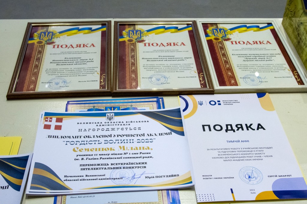 Понад 70 переможців та призерів міжнародних та всеукраїнських конкурсів нагородили дипломами «Гордість Волині-2023» та подарунками, а їх наставники отримали подяки профільних міністерства та управління ОВА. Тріумфаторам престижних міжнародних інтелектуальних конкурсів також презентували путівки на відпочинок у дитячому таборі «Артек-Буковель».