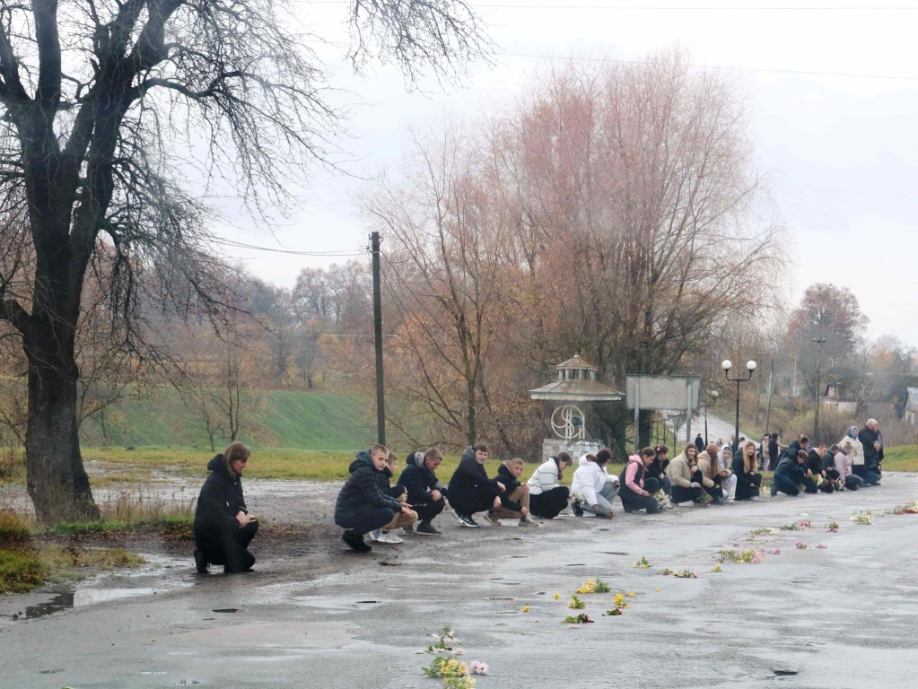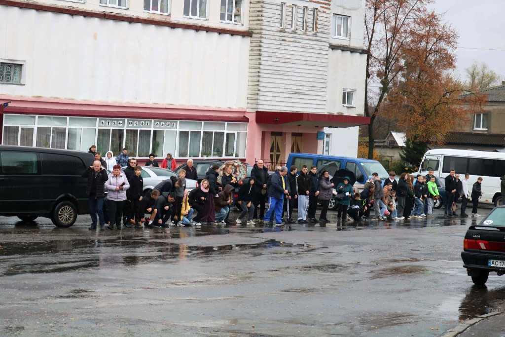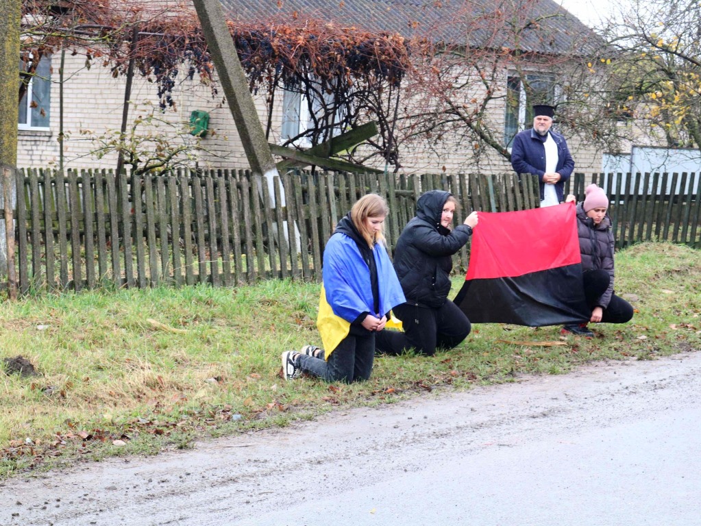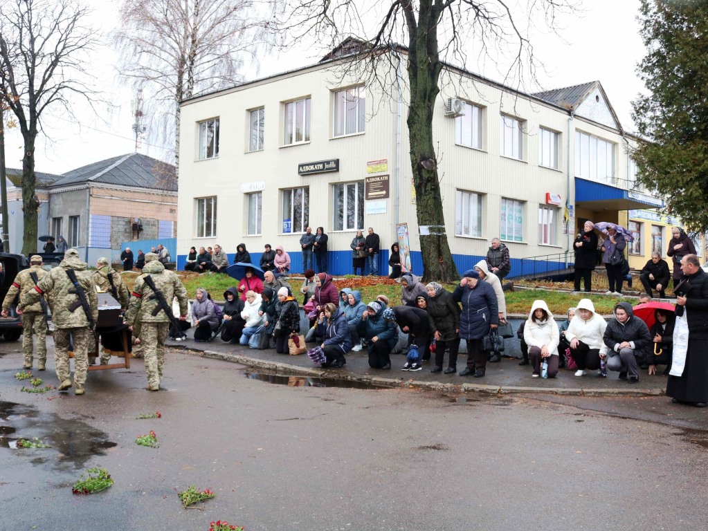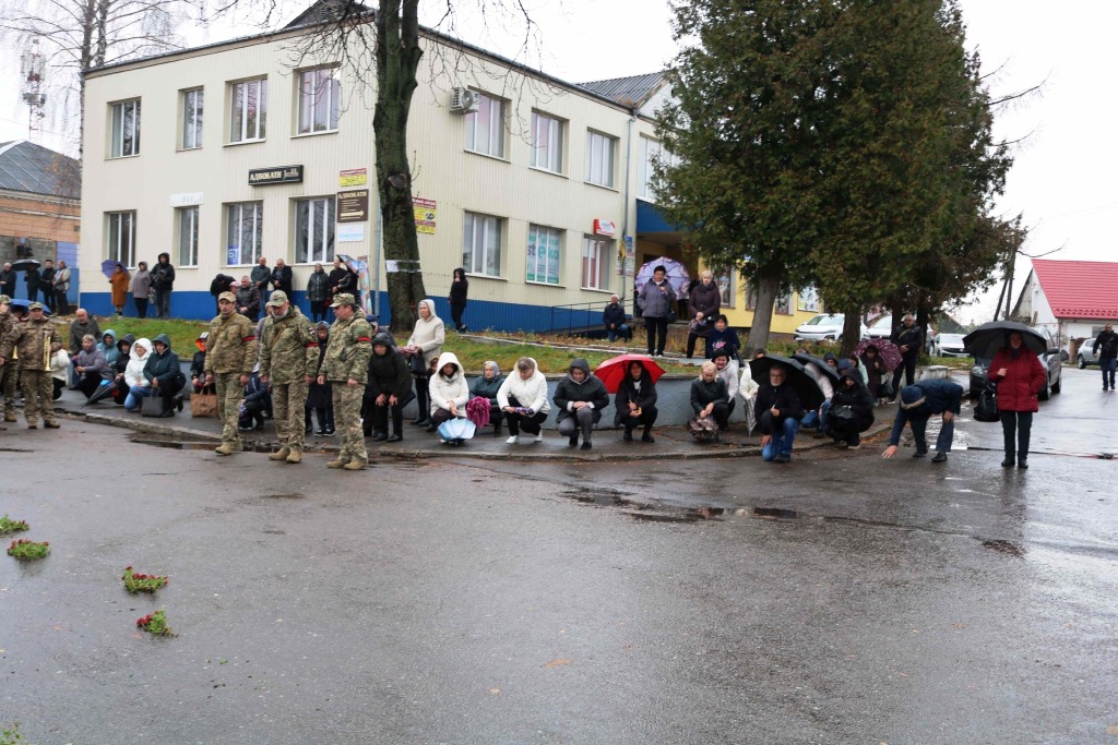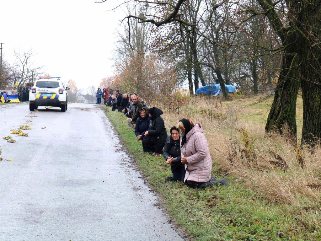 Траурний кортеж зустрічали коридором шани жителі громади, які на колінах покладали квіти перед автомобілем з домовиною земляка.