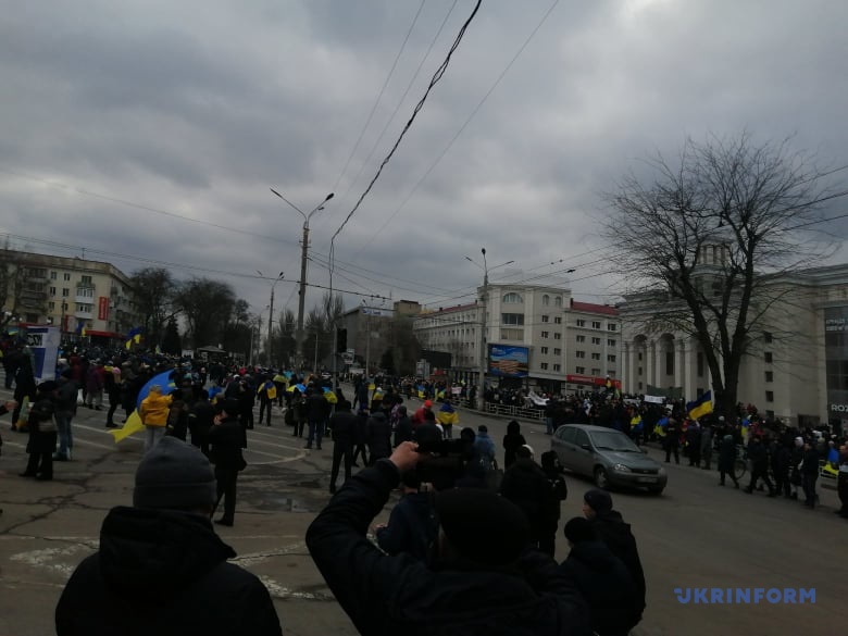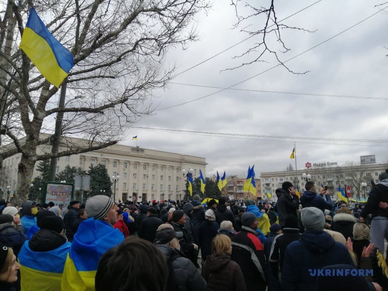 На центральній площі Свободи у Херсоні, біля будівлі захопленої російськими загарбниками ОДА розпочалася масова мирна акція протесту.
