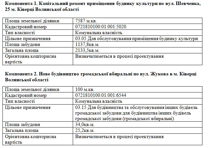 Ківерці Волинської області ( Компонента 2), а також найшвидші терміни робіт з капітального ремонту приміщення будинку культури на вул. Шевченка, 25 м. Ківерці Волинської області ( Компонента 1) та здачі в його експлуатацію.