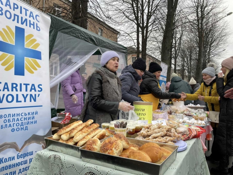 Тістечка, печиво, булочки, пиріжки та іншу випічку приготували господині Благодійної їдальні. Свічки та сувеніри виготовили вихованці простору, дружнього до дитини, який функціонує на базі БФ “Карітас-Волинь”.