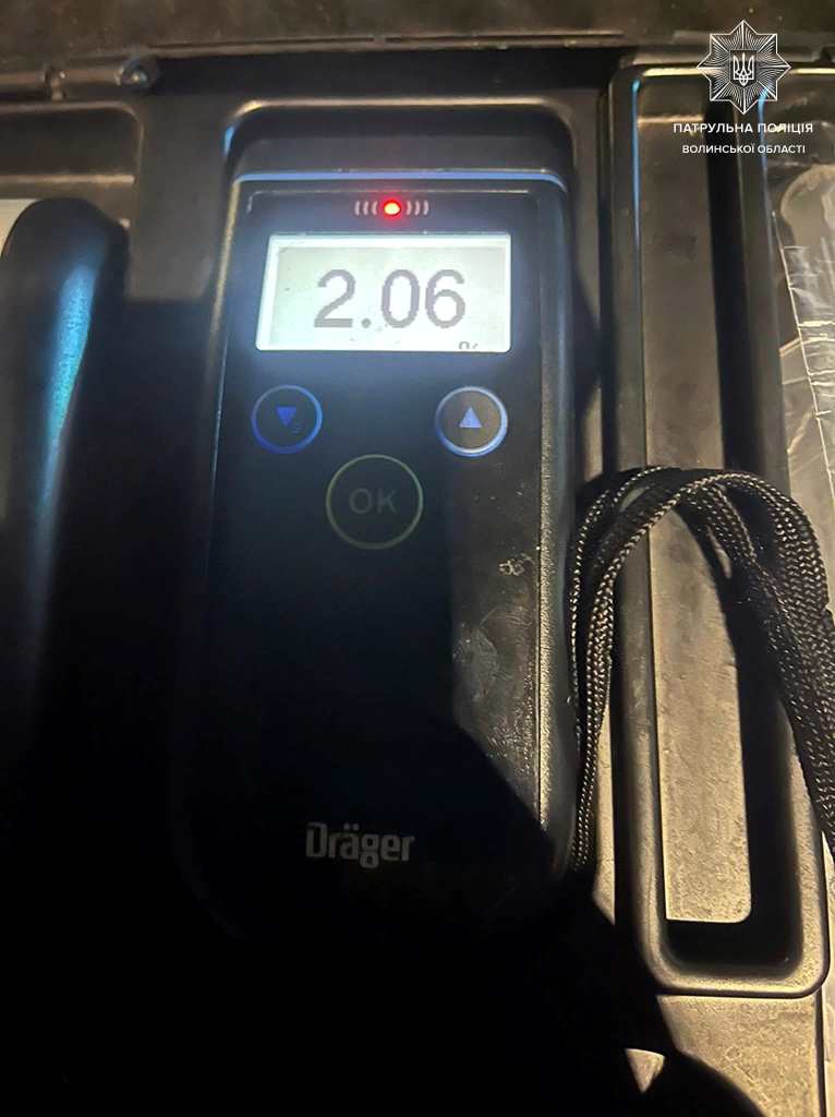 Під час спілкування патрульні виявили у чоловіка ознаки алкогольного сп’яніння. Керманич погодився пройти огляд за допомогою приладу Драгер. Результат — 2,06 проміле, що більш ніж у 10 разів перевищує допустиму норму.