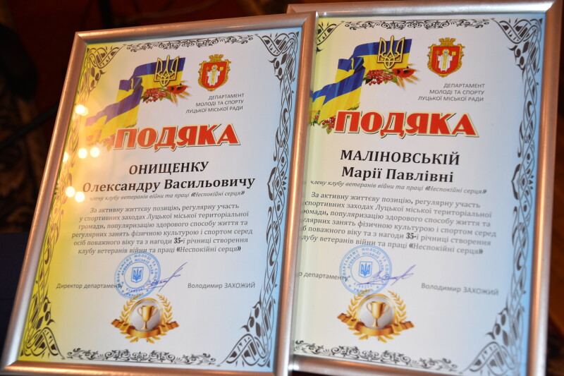 Цікаво, що учасники клубу є переможцями різних конкурсів, нагороджені грамотами Збройних сил України, управління культури і туризму Волинської облдержадміністрації. Не обходять увагою ветеранів і міські служби та установи. Знаючи це, Ірина Чебелюк побажала “Серцям” ще більшого визнання, але вже на рівні держави. В подяку за це отримала оплески та кілька музичних композицій. Публіку розважив ансамбль “Джерела Волині”.