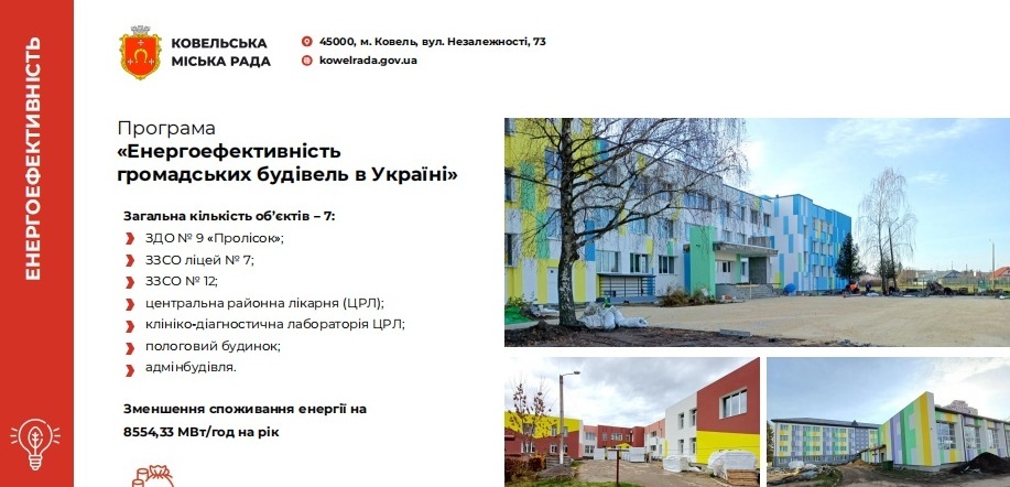 Термомодернізація семи об’єктів: ЗДО № 9 «Пролісок», ліцеїв № 7 і № 12, будівель ЦРЛ, діагностичної лабораторії, пологового будинку та адмінбудівлі. Заходи дозволять щороку економити 8554,33 МВт/год енергії.