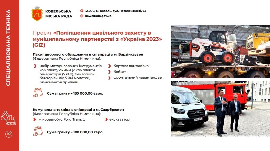 У місто надійшли: бортова вантажівка, бобкат, фронтальний навантажувач, мікроавтобус Ford Transit, екскаватор, набори моторизованих інструментів (2 комплекти генераторів 5 кВт, бензопили, бензорізи, відбійні молотки, прилади).