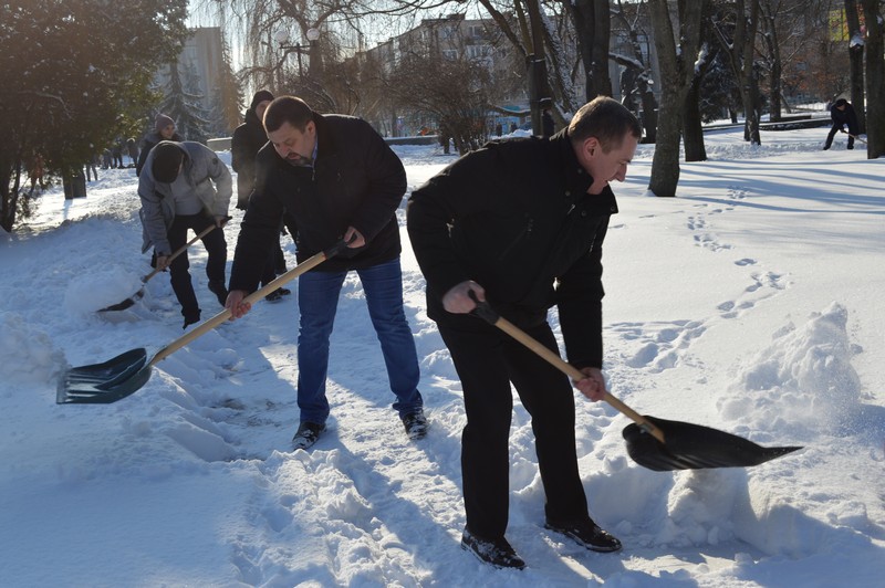 Представники міської влади, серед яких голова, його заступники, прибирали від снігу парк імені Лесі Українки.