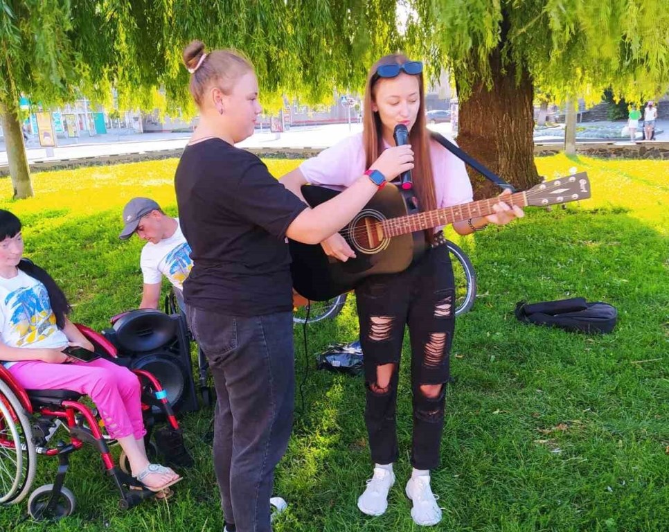 Дівчина з гітарою, яка прийшла на ярмарок, зачарувала присутніх своїм виступом. Українські патріотичні пісні додали усім бойового духу.
