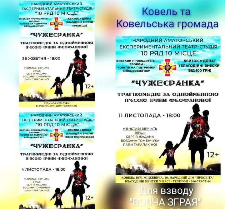 4 листопада «10 ряд 10 місце» гратиме у селі Доротище, 11 листопада – повтор вистави «Чужесранка» з оновленим акторським складом у Ковелі.