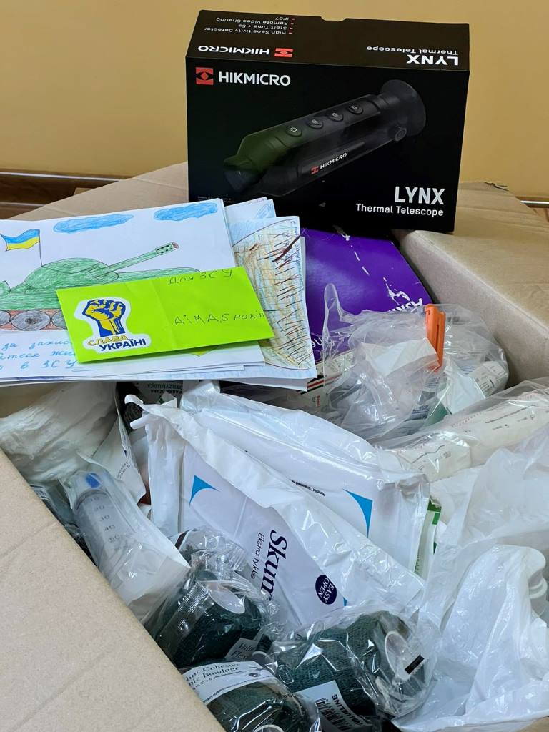 А ще малеча підготувала обереги для захисників України – дитячі малюнки та листи, які надихають, підбадьорюють та підтримують дух українських воїнів на фронті. Передали й медичні засоби: перев’язувальні матеріали, бандажі, пластирні пов’язки, засоби для обробки ран.
