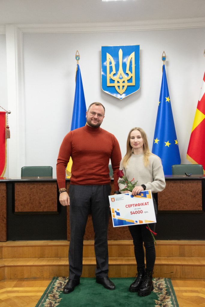 У ході зустрічі із провідними спортсменами міський голова Ігор Поліщук виконав ще одну приємну місію – вручив стипендіатці Єлизаветі Труш посвідчення і нагрудний знак майстра спорту України з тенісу.