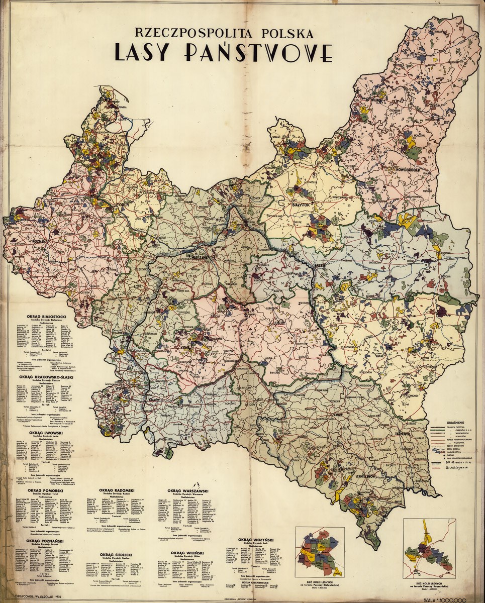 Державні лісництва, тартаки та лісові вузькоколійні залізниці: цікавим історичним документом лишається мапа, що відображує стан державних лісів Республіки Польщі напередодні Другої світової війни. Цей документ надрукували у 1939 році у краківській друкарні «Sztuka».