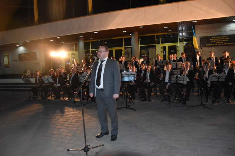 Так, о 22:00 на Театральному майдані Луцька розпочалася cвяткова концертна програма. Перед присутніми виступили викладачі та студенти Волинського державного училища культури і мистецтв імені І. Ф. Стравінського. Учасники заходу, серед яких голова Волинської облдержадміністрації Олександр Савченко, заступник голови Волинської обласної ради Роман Карпюк, секретар Луцької міської ради, виконувач повноважень міського голови Григорій Пустовіт мали можливість послухати прекрасні музичні твори.
