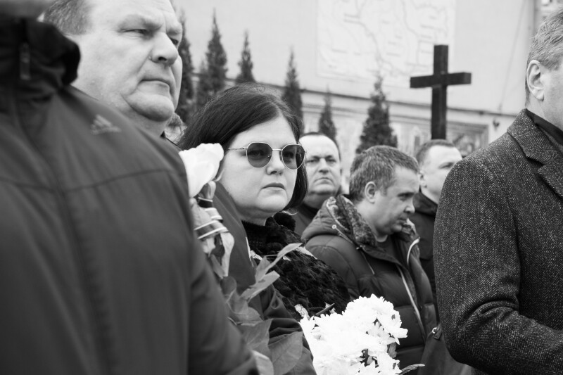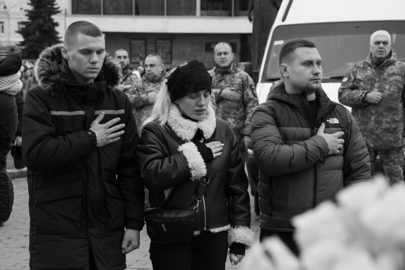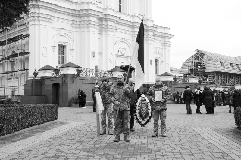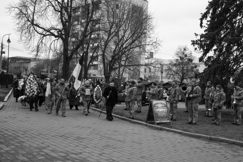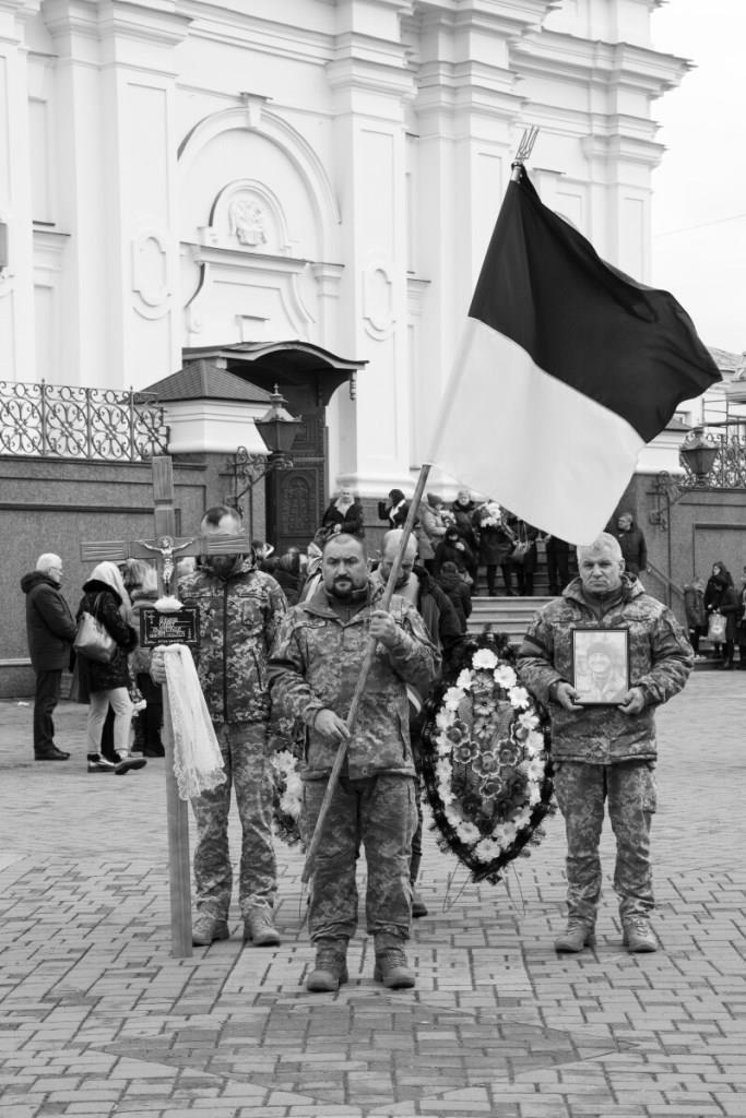 Після завершення богослужіння домовину з тілом загиблого захисника пронесли Театральним майданом. Біля пам’ятного фотостенду “Герої Небесної Сотні – Загинули за єдність України” траурна процесія зупинилася і виконала Державний Гімн.