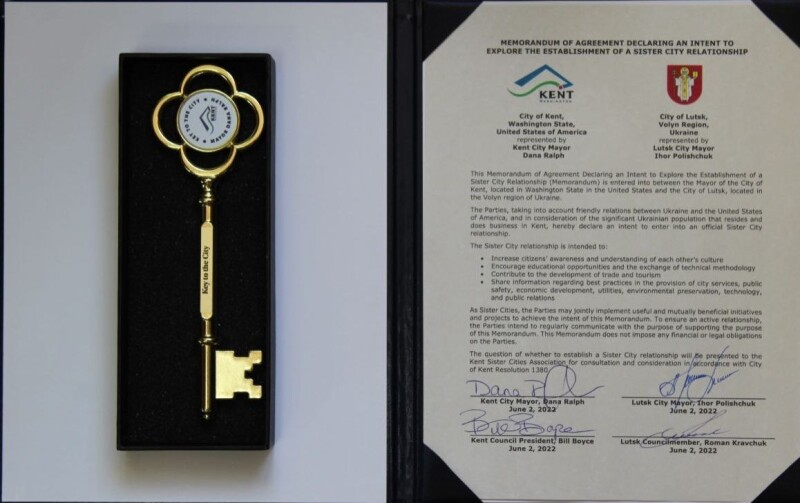 2 червня між містами Кент (США) та Луцьк (Україна) офіційно задекларували намір щодо початку процедури встановлення побратимських відносин. Відповідний документ підписали у місті Кент, США, під час онлайн зустрічі Луцького міського голови Ігоря Поліщука та мера міста Кент Дейни Ральф. Окрім очільників міст учасниками заходу були також: голова ради міста Кент Білл Бойс, Почесний консул України в Сіетлі (США) Валерій Голобородько та депутат Луцької міської ради Роман Кравчук.