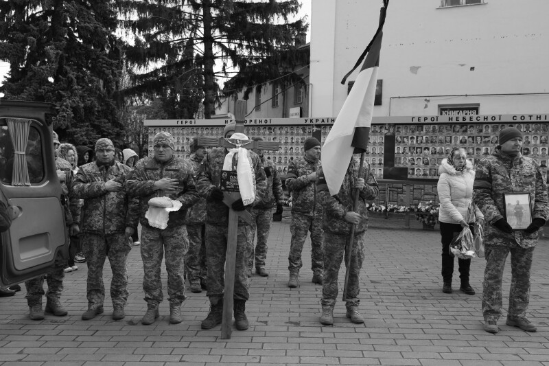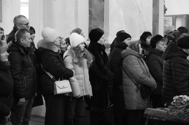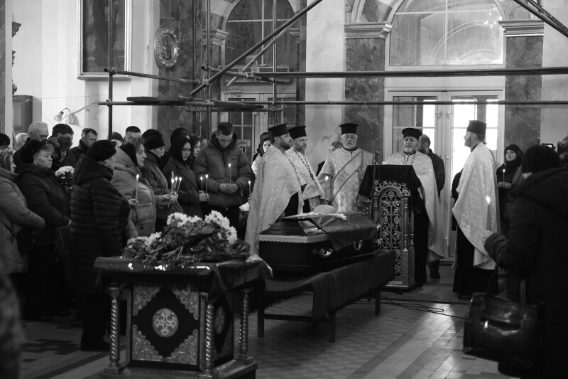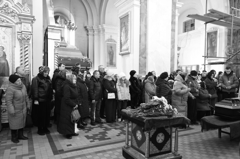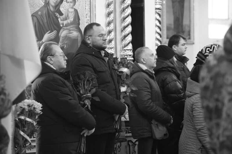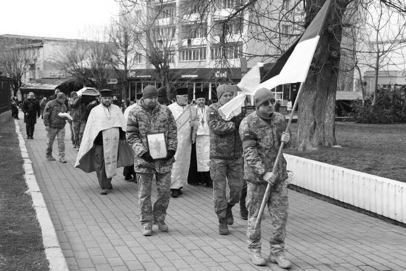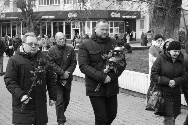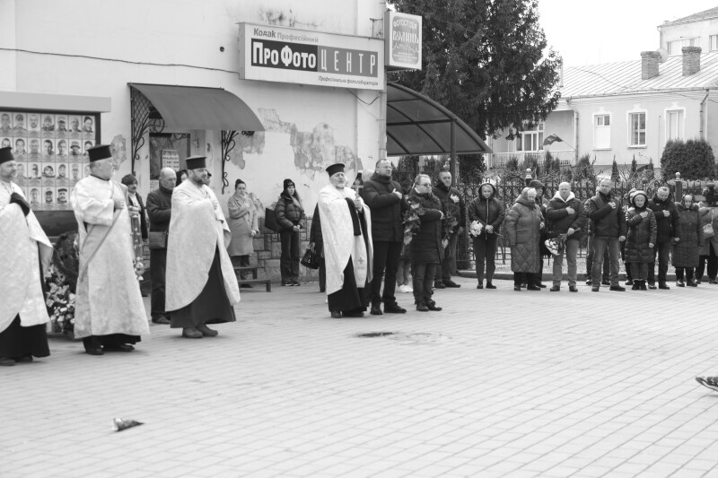 Після завершення богослужіння труну з тілом захисника пронесли Театральним майданом. Біля пам’ятного фотостенда загиблим Героям траурна процесія зупинилася і виконала Державний Гімн.