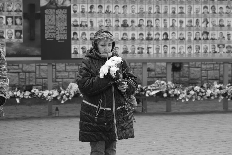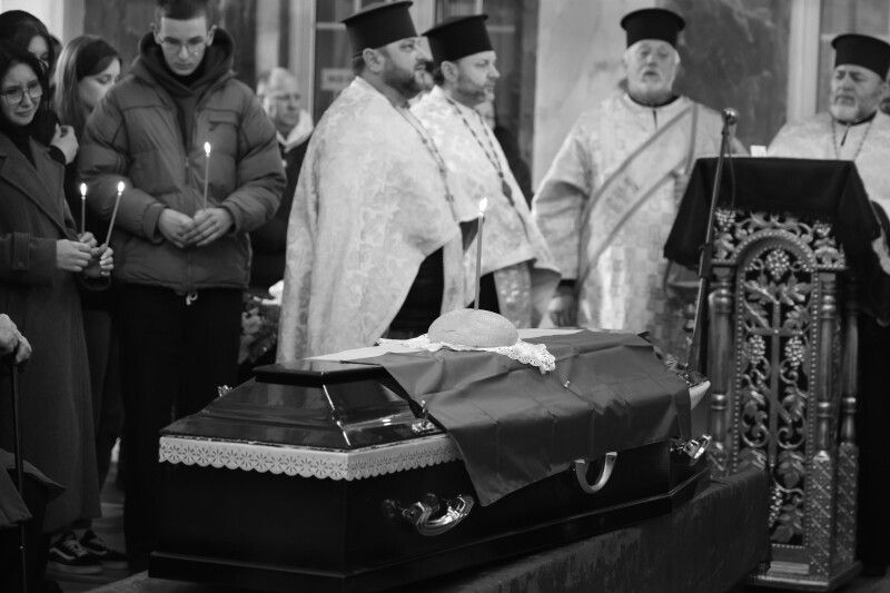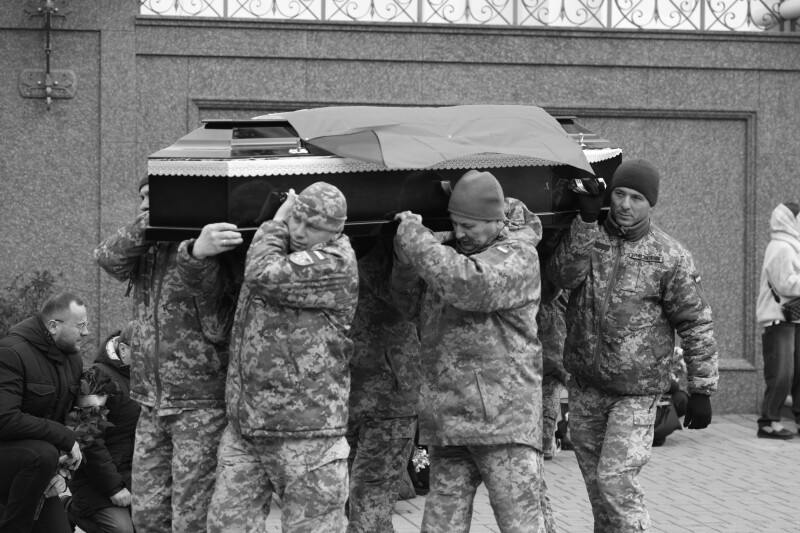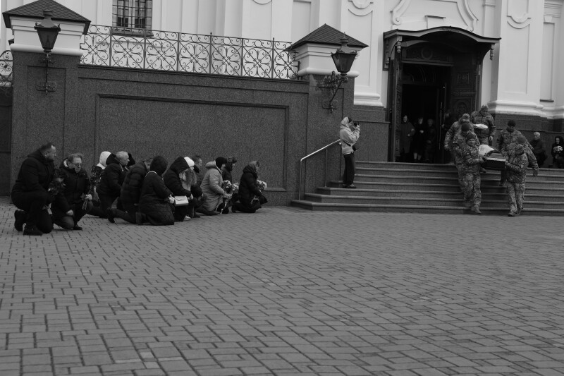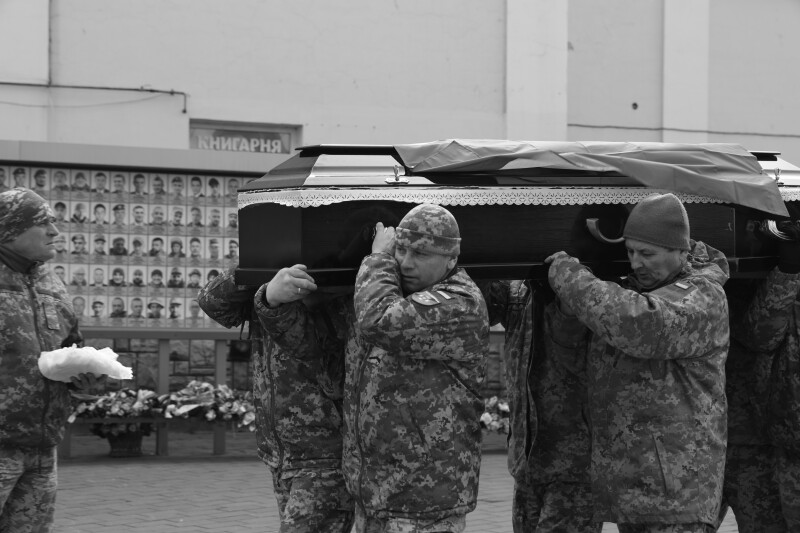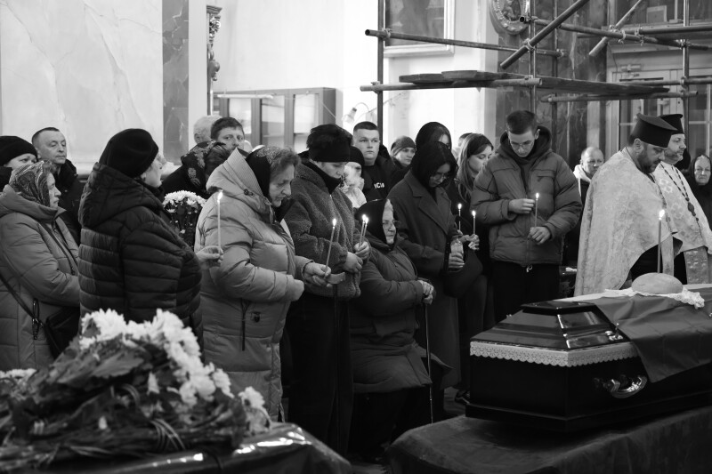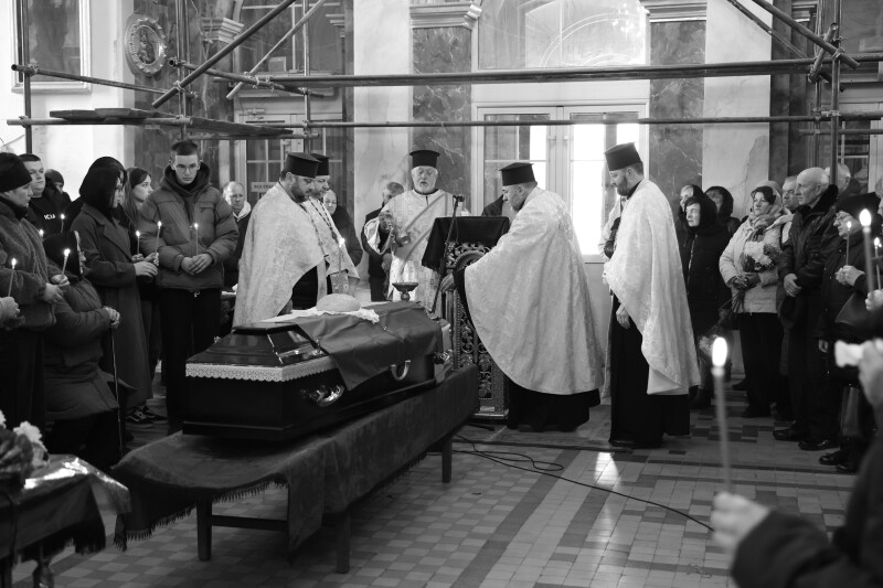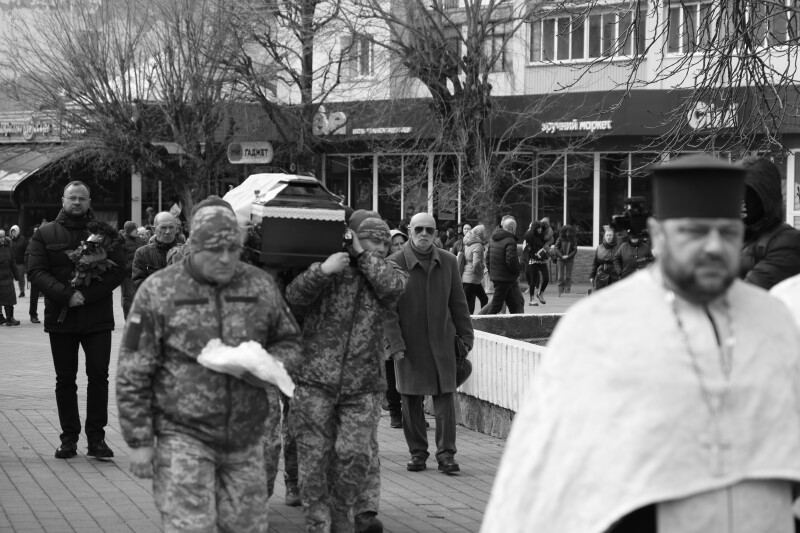 Після завершення богослужіння труну з тілом захисника пронесли Театральним майданом. Біля пам’ятного фотостенда загиблим Героям траурна процесія зупинилася і виконала Державний Гімн.