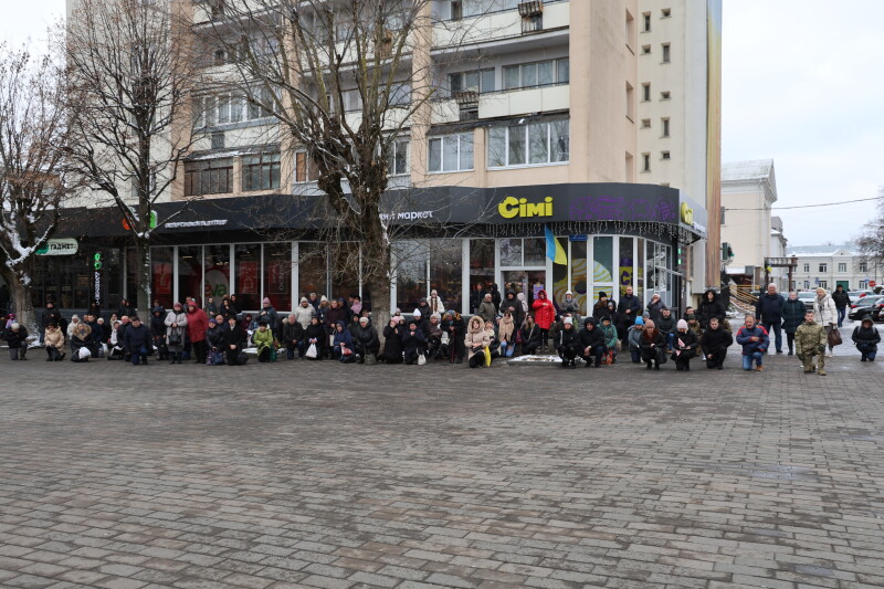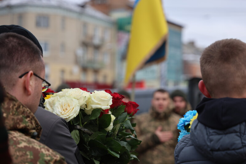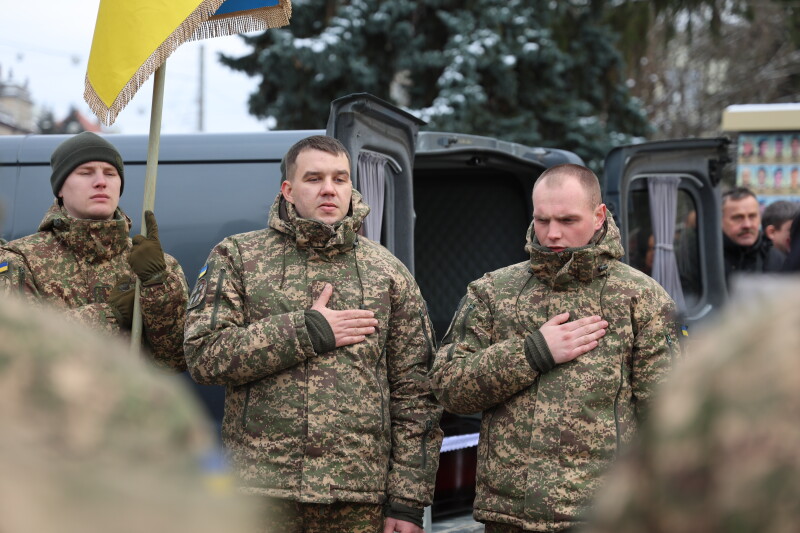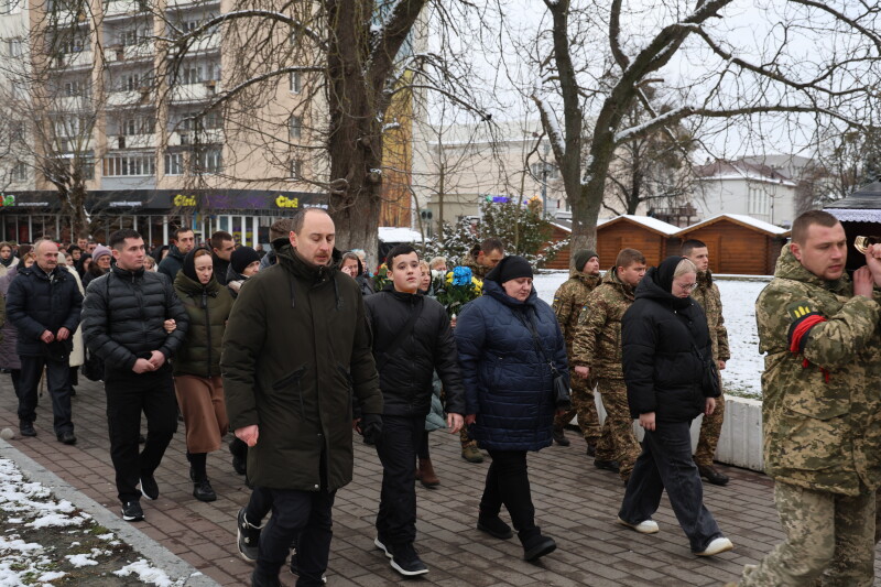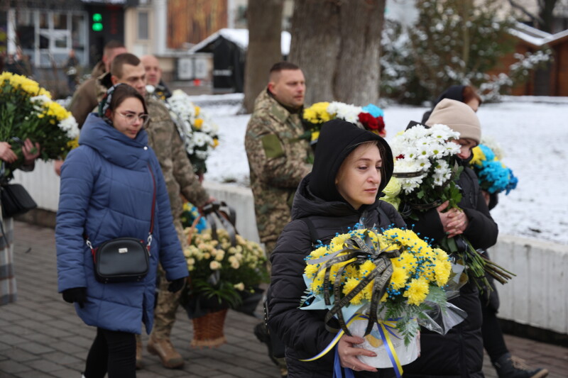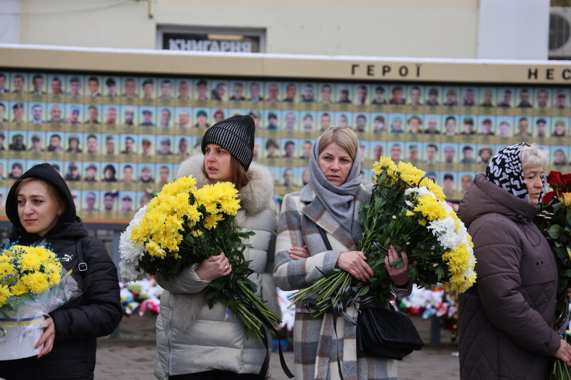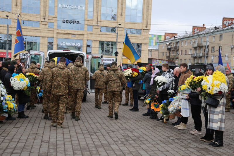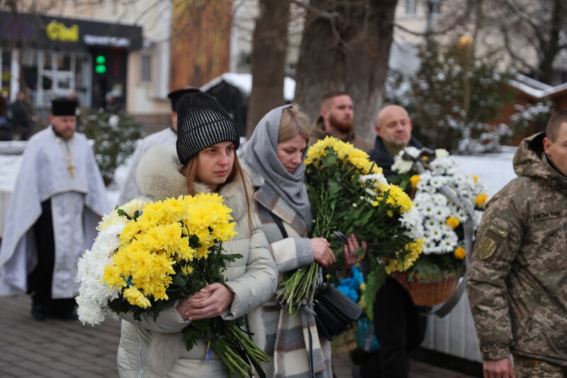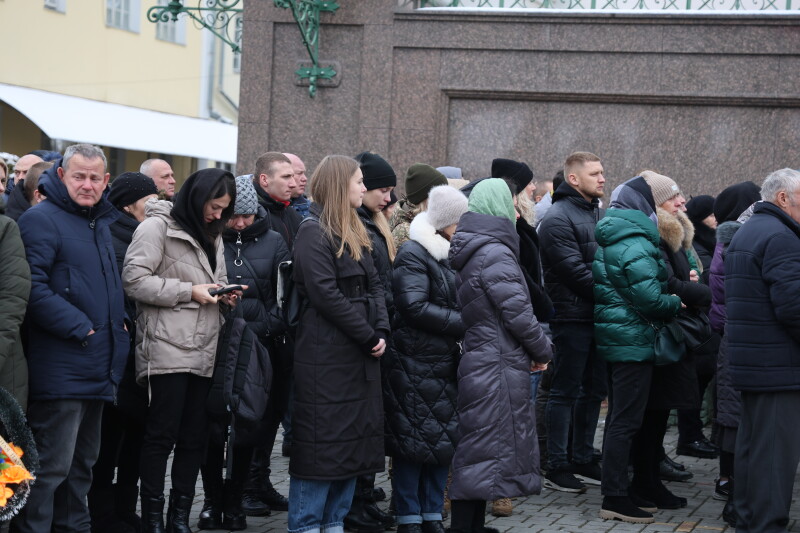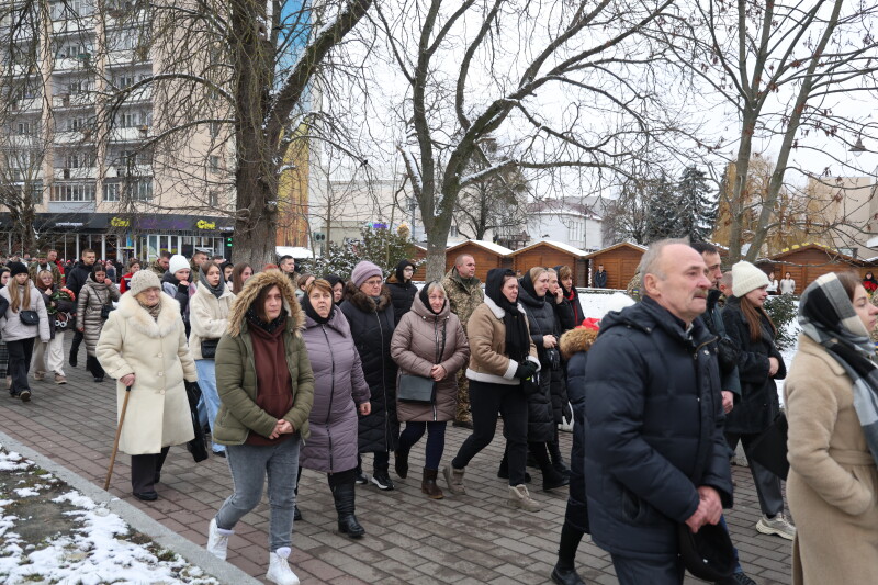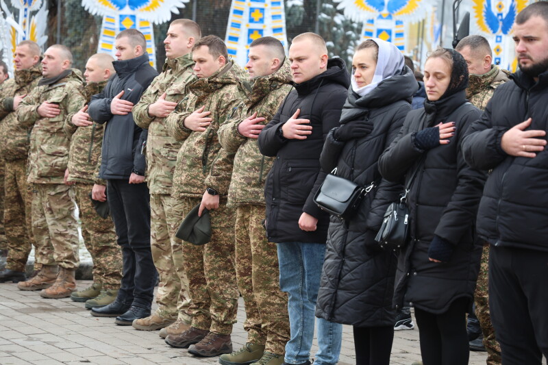 Після завершення богослужіння труни з тілами полеглих захисників пронесли Театральним майданом. Біля пам’ятного фотостенда загиблим Героям присутні зупинилися і виконали Державний Гімн України.