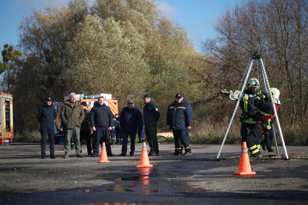 Начальник ОВА Юрій Погуляйко оглянув як відбувались навчання фахівців підрозділів служби 101, під час яких відпрацювали порядок рятування людей з висотних будівель у випадку пожежі, рятування людей з-під завалів будівельних конструкцій у випадку вибуху та рятування людей з ям за допомогою спеціального обладнання.