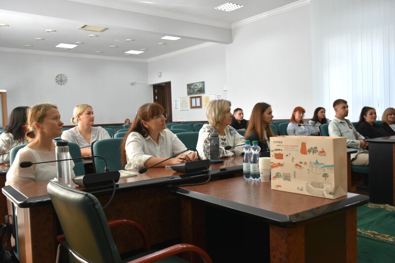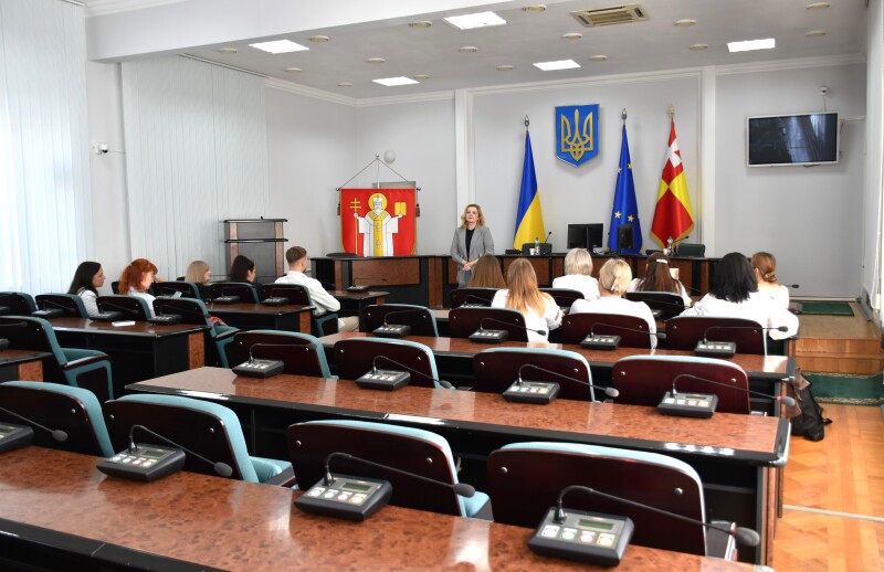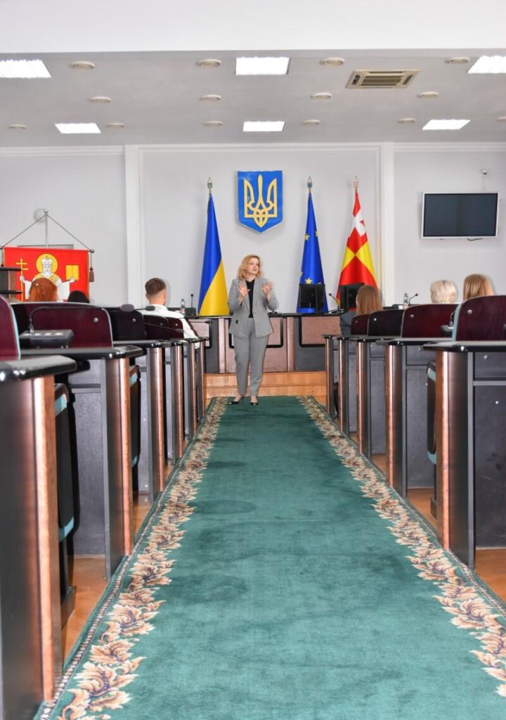 Після вітального слова вона розповіла про географічні, економічні, культурні особливості Луцької громади, можливості її бюджету, організацію роботи різних галузей, підтримку ВПО. Окремо зупинилася на актуальних викликах сьогодення та грантовій і проєктній діяльності.
