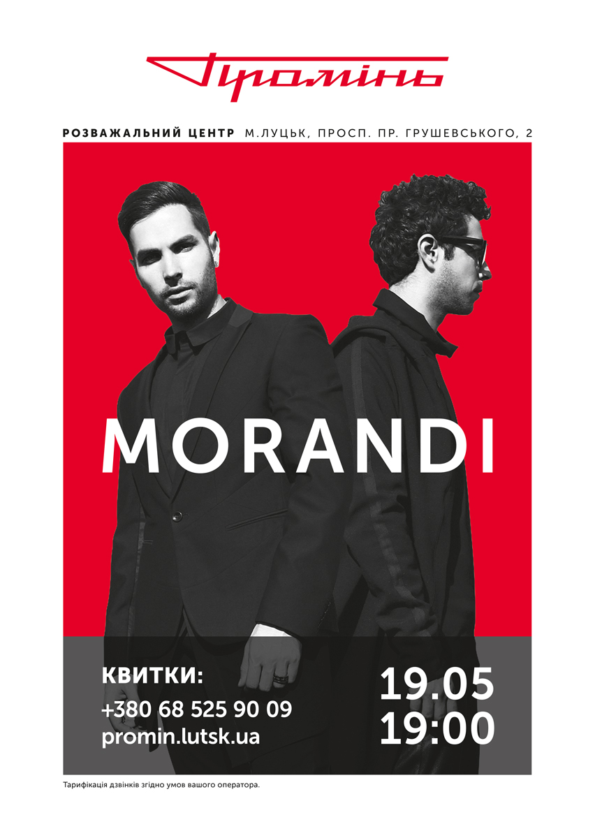 “Цієї весни, 19 травня у РЦ «Промінь» відбудеться концерт «Morandi». Це румунський поп-гурт, відомий в усі регіонах Східної Європи! У свій час покорили серця кожного. Їхній кожен трек – хіт! Такі пісні, як «Love me», «Angels», «Save me» – вже давно стали улюбленими та змушують підспівувати не задумуючись, – кажуть організатори. – «Morandi» повноправно займає своє почесне місце в списку кращих танцювальних поп-гуртів Європи. Про це свідчить і номінація на MTV Europe Awards, і перебування їх синглів у World Chats Express і MTV Europe Chart. Хіти «Morandi» «Falling Asleep», «Angels», «Save me» можна було почути на дискотеках і на радіо майже в будь якій країні світу”.