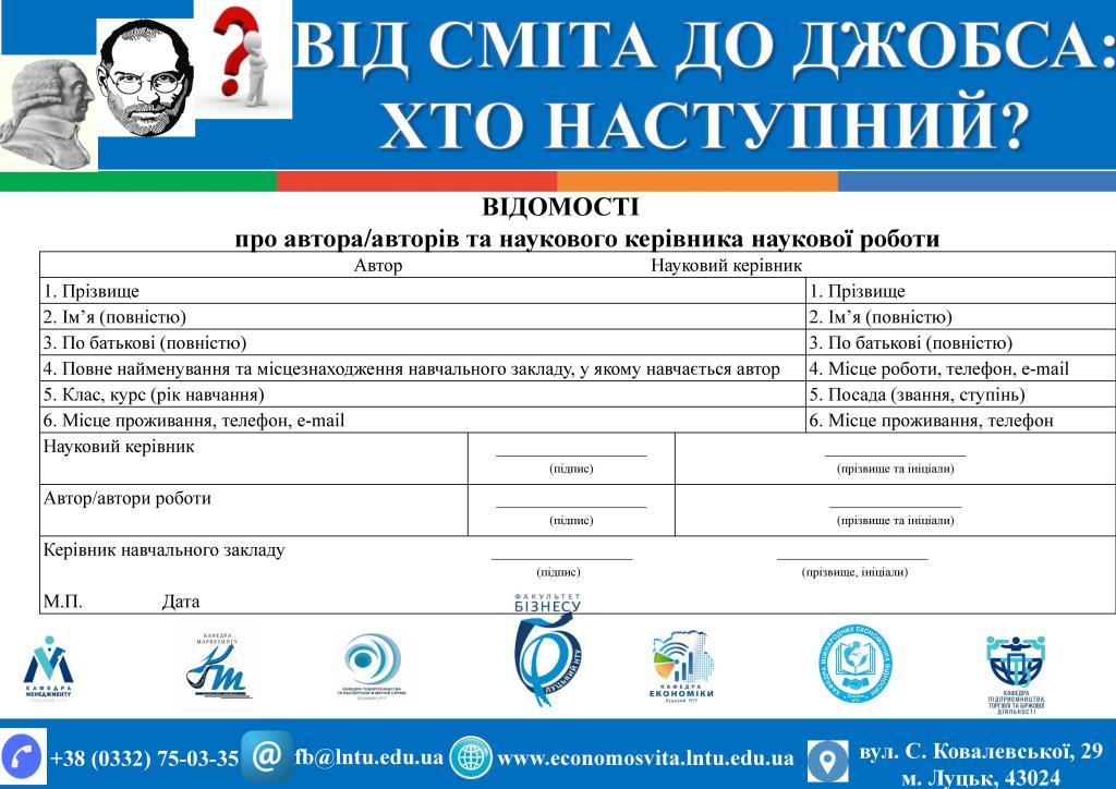 Терміни подачі документів: до 5 квітня – роботи потрібно надсилати на факультет бізнесу (електронний варіант – fb@lntu.edu.ua та друкований – вул. С. Ковалевської, 29, м. Луцьк).