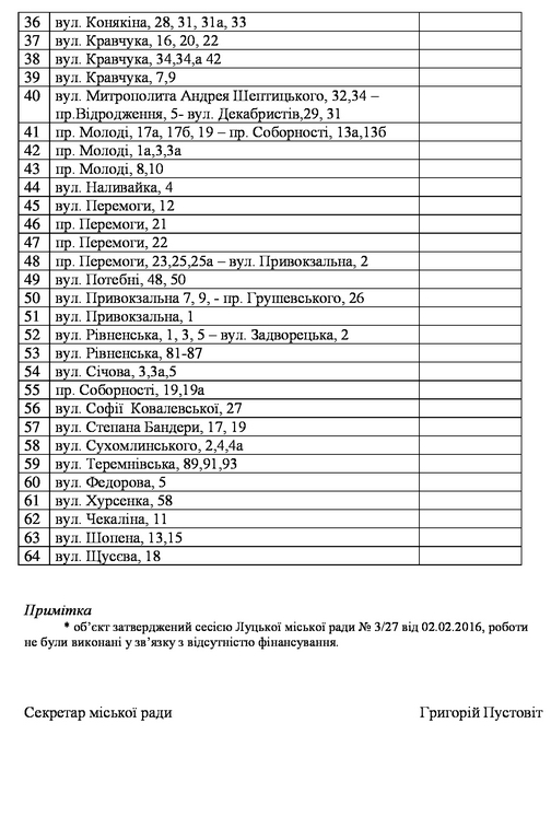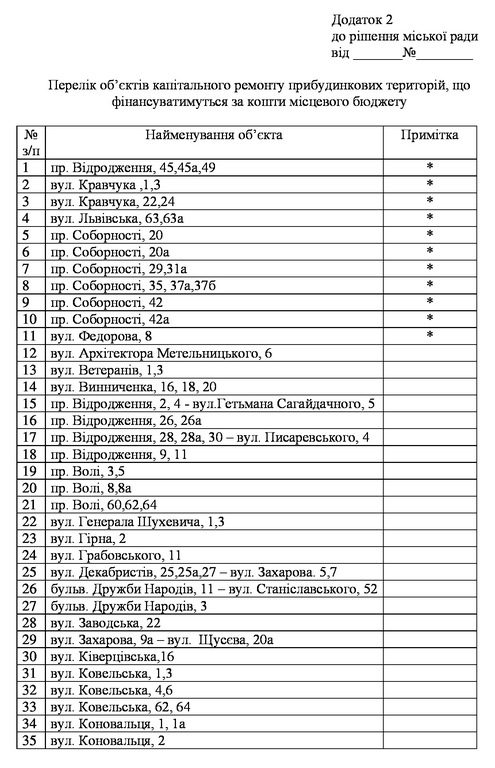 Подаємо перелік вулиць та дворів, який затвердили на сесії Луцькради. Окрім внесених до таблички, включили ще прибудинкову територію на вулиці Січовій, 7, до вулиць Старого міста включили площу Ринок та вулицю Драгоманова. А також замінили Конякіна 29, замість Конякіна 28, оскільки це технічна помилка